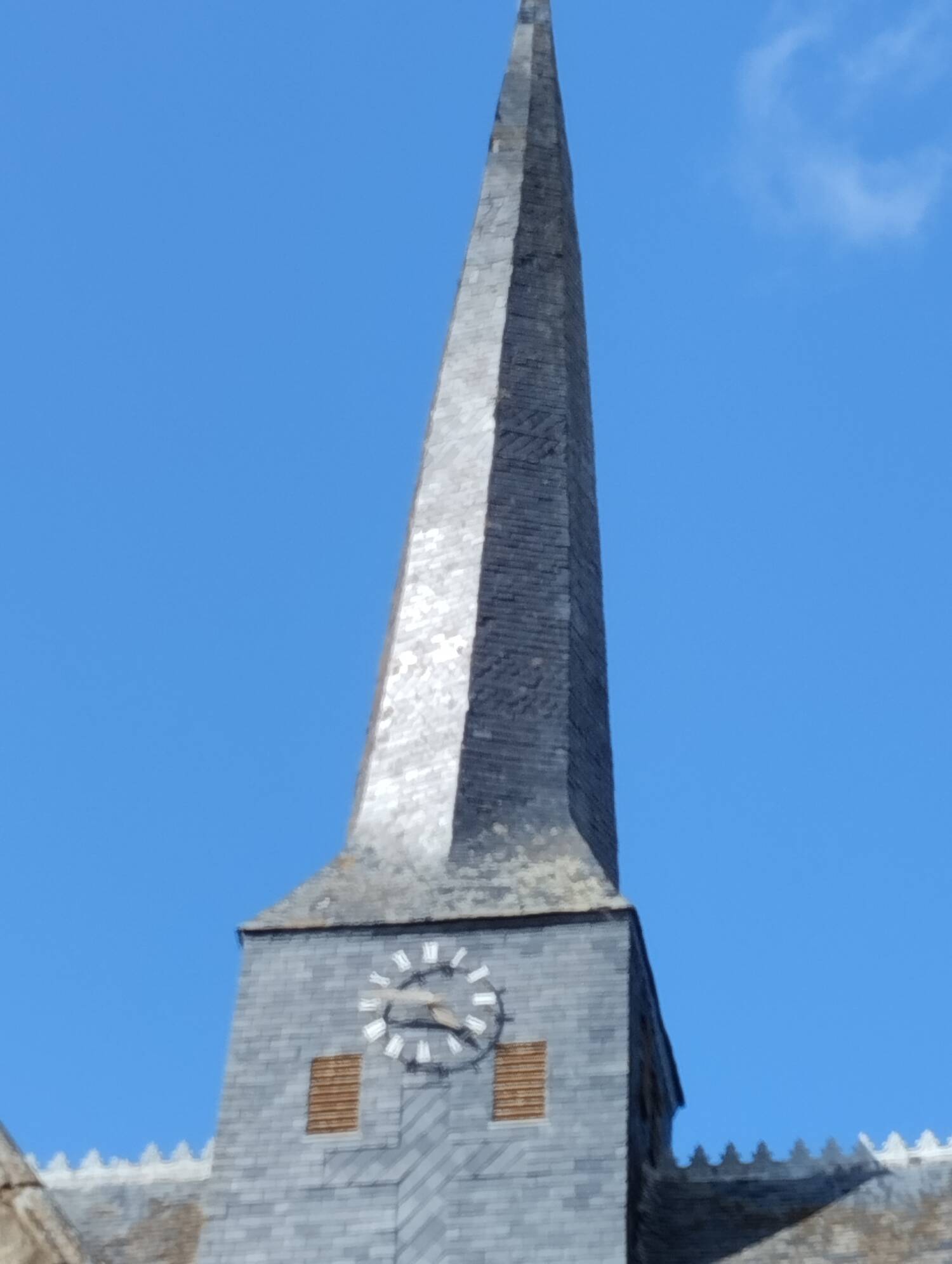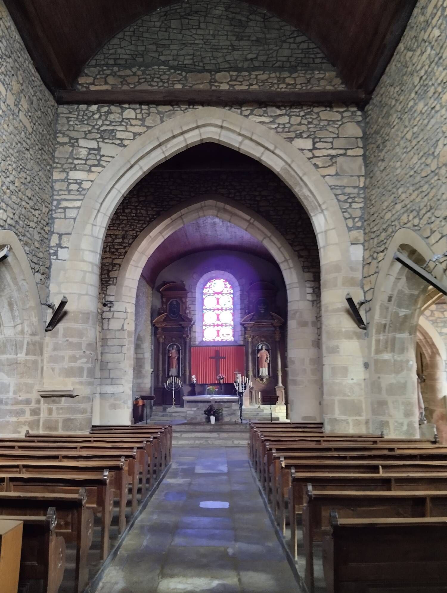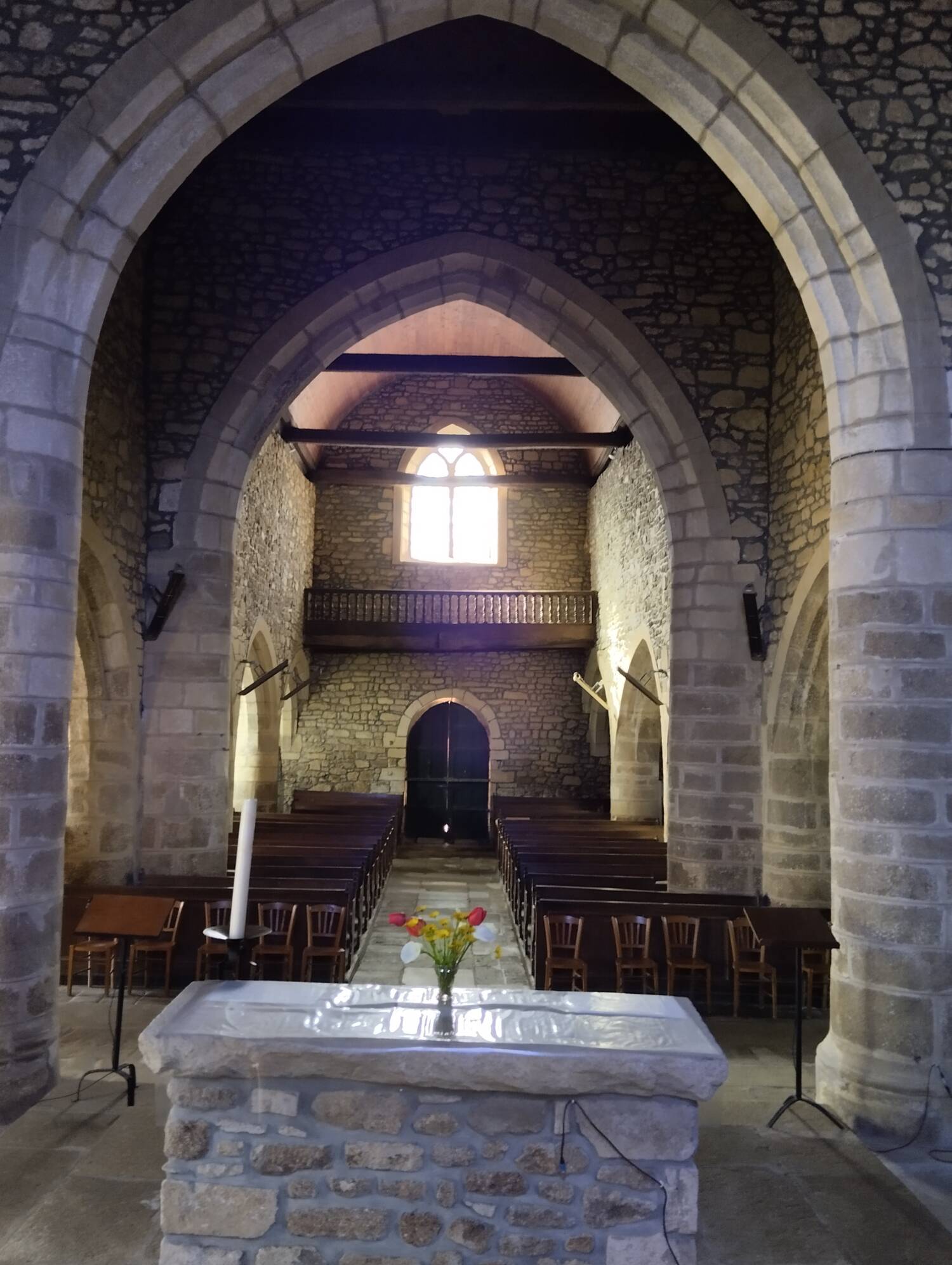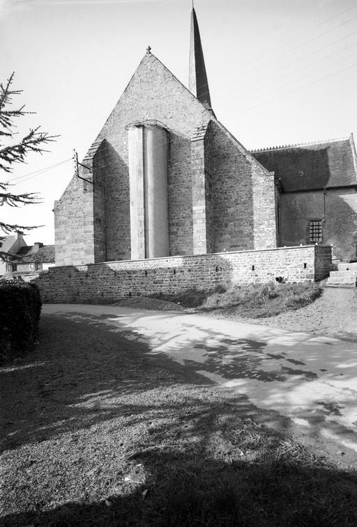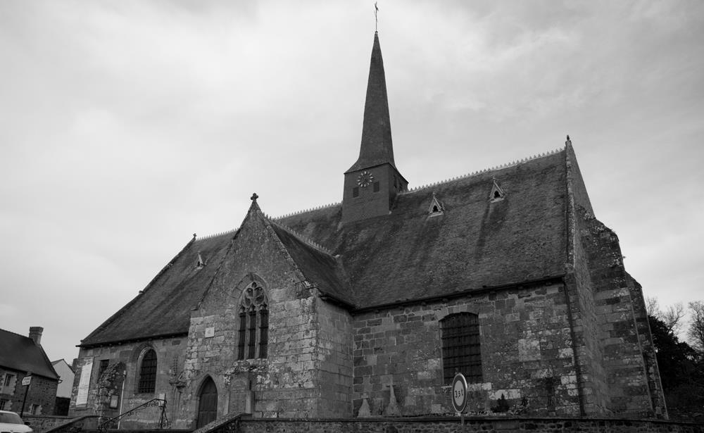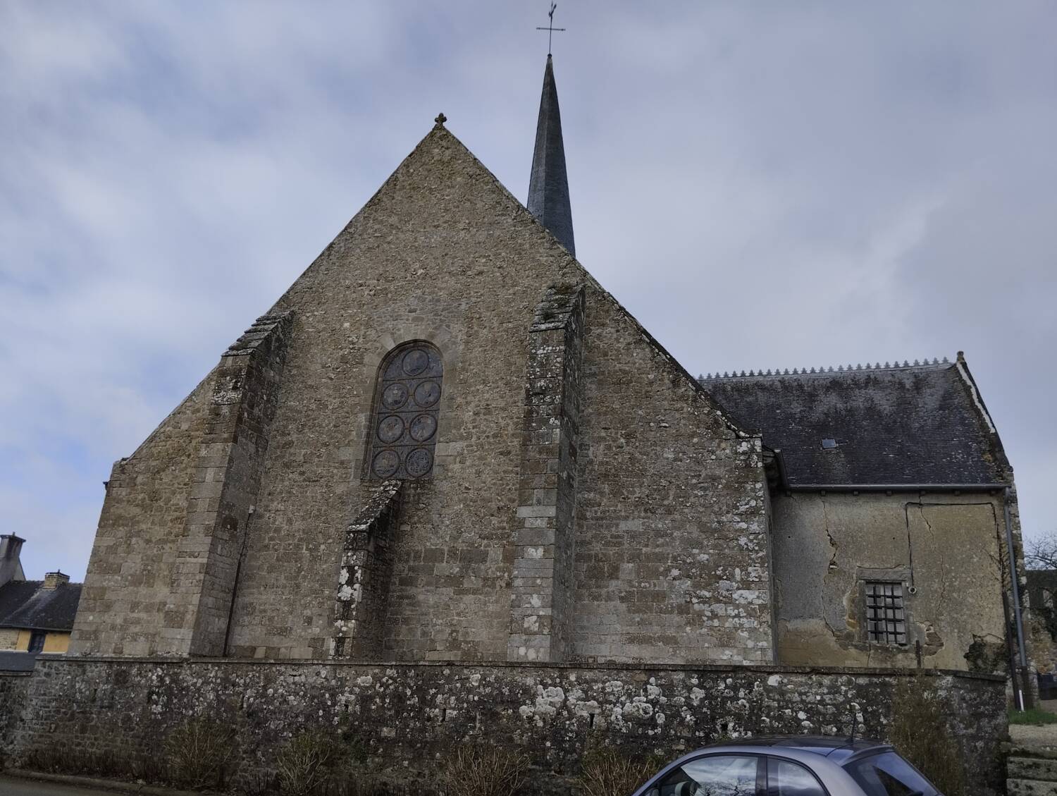 L´église paroissiale est encore partiellement entourée de son cimetière. L´enclos conserve à l´ouest un échalier de protection. Orientée à l´est comme la plupart des anciennes églises, elle est de plan en croix latine irrégulier et à chevet plat. Elle possédait au sud un porche qui a aujourd´hui disparu comme en témoigne la gouttière et sa gargouille incrustée dans le mur ouest de la chapelle sud qui forme bras de transept. Une sacristie est flanquée contre le mur nord du choeur. Le clocher en charpente est situé à la rencontre de la nef et du chœur, il se distingue par une flèche polygonale couverte d´ardoises. L´ensemble, de proportions harmonieuses, est remarquable à plusieurs égards. Le portail ouest de style gothique tardif porte la date en lettres gothiques de 1465 suivie de l´inscription IHESUS MA (RIA). Cette campagne de travaux correspond à la datation de l´église qui est par ailleurs relativement homogène, en dehors des travaux du choeur effectués au 18e siècle.Des armoiries en parties effacées sont encore visibles au dessus du portail ouest : blason avec un casque ouvert à lambrequins. Une litre seigneuriale bûchée à la Révolution est également visible à l´intérieur de l´église.La chapelle sud autrefois privative était réservée aux seigneurs de Beaumont dont le château se situe actuellement sur la commune de Guitté.La chapelle nord anciennement réservée aux seigneurs de la Roche est également appelée la chapelle de la Vierge ou du Rosaire.