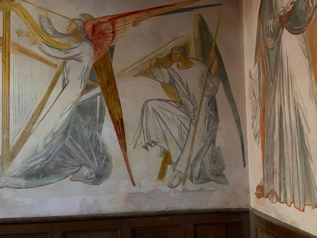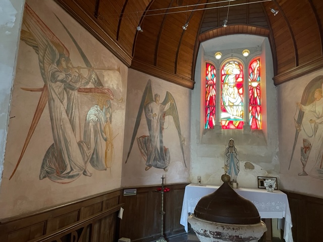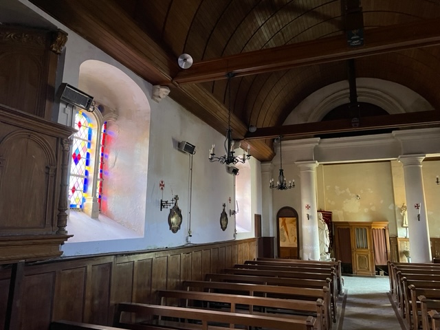 A l’intérieur, la nef est voûtée en bois et en berceau, à poutres apparentes, le chœur est également voûté en berceau mais il n’est pas lambrissé. Un arc triomphal délimité la nef du chœur.