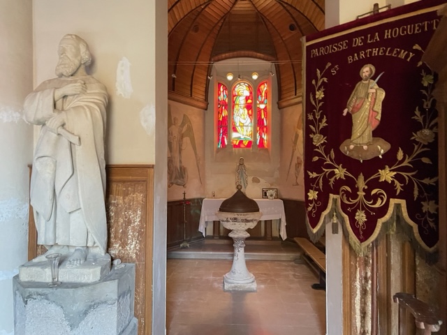 L’église Saint Barhélémy de la Hoguette est orientée et bâtie selon un plan allongé d’un cimetière. L’église se compose de quatre bâtiments : le clocher porche, la nef des fidèles à trois travées, le chœur à trois travées et un dernier bâtiment qui peut être une sacristie ou une chapelle aux petites dimensions, jouxtant le mur gouttereau sud. Le chevet est plat.