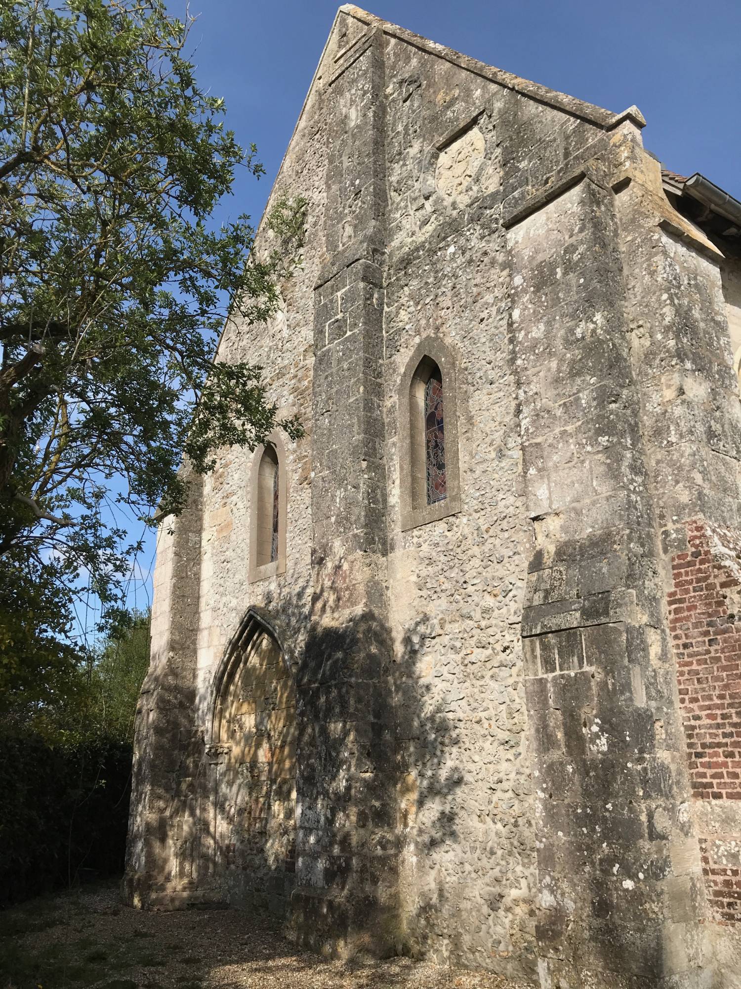 Côté sud, les deux contreforts de gauche datent vraisemblablement du XIIe. La tour du beffroi est accolée à la bâtisse.