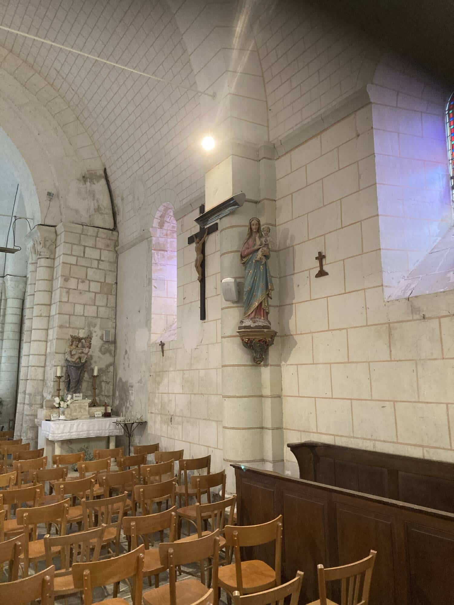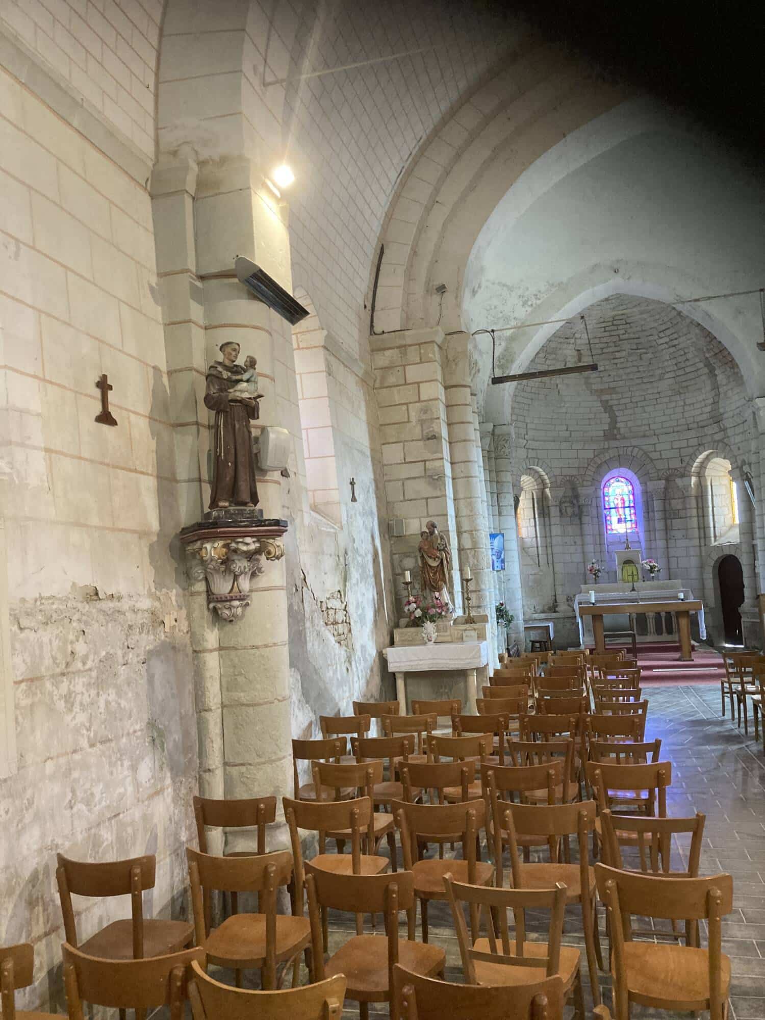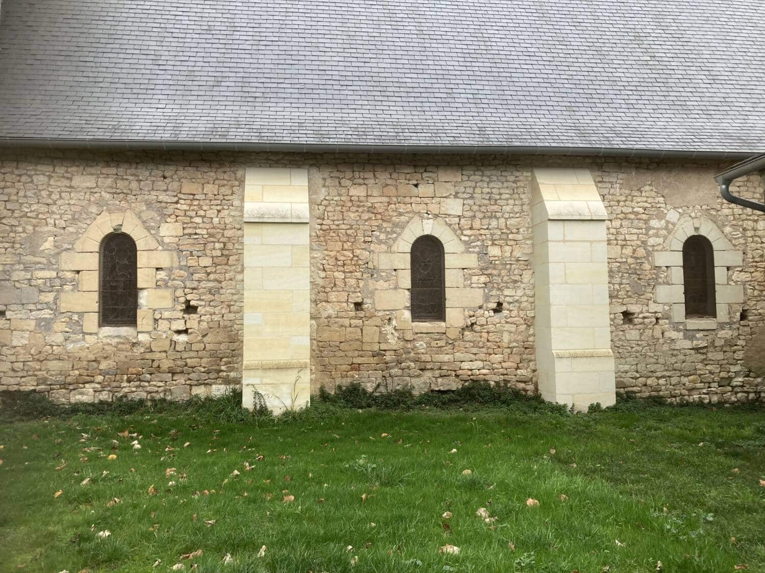 L’église de Claunay aujourd’hui réunie à la commune de La Roche-Rigault, présente un chevet en abside datant du deuxième quart du XIIe siècle, constituant la partie la plus ancienne de l’édifice. Cette abside est voûtée en cul-de-four et était initialement ornée de modillons romans, aujourd’hui restaurés. Le transept, non saillant, également daté du XIIe siècle, est surmonté d’un clocher dont la charpente d’origine a disparu suite à un incendie; la couverture actuelle, à faible pente, a été rendue définitive en 1978. La croisée du transept était à l’origine couverte d’une coupole nervurée, dont subsistent les colonnettes d’angle, témoins des retombées des nervures. La coupole actuelle est une reconstruction légèrement différente de l’originale. La façade occidentale est de style roman, tandis que la nef, unique, est postérieure au reste du bâti. L’édifice conserve également des traces de peintures murales des XVe ou XVIe siècles, notamment une scène de martyre et une litre armoriée encore partiellement visible.