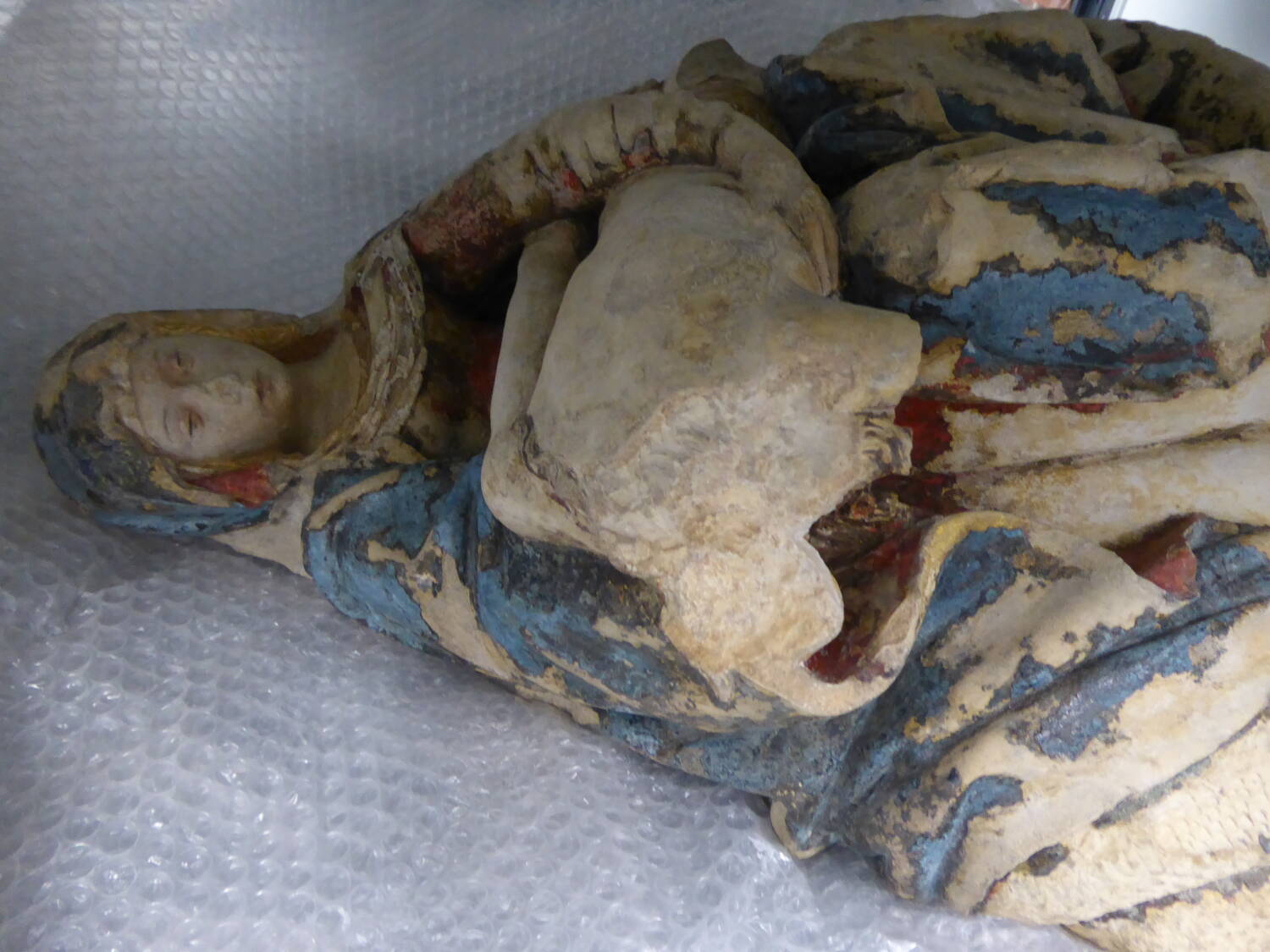 Cette sculpture en pierre polychrome datant vraisemblablement de la fin du XVème siècle ou du début du XVIème siècle reste un mystère. Une étude préalable, confiée à la restauratrice Madame Dominique Faunières, a révélé de nombreuses interventions de restauration et de reprises de la polychromie sur la statue avant son enfouissement ; témoignage de l’attention portée à cette œuvre au cours des siècles. Son origine et son auteur demeurent pourtant inconnus.