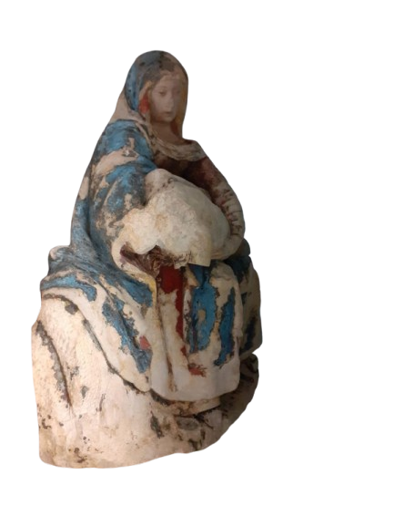 Bien que mutilée, notamment au niveau de la main de la Vierge, des têtes, du bras et de la jambe droite du Christ, la statue est globalement restée bien conservée malgré son important état d’encrassement. À sa découverte, elle était couverte de résidus de plâtre et présentait d’importants dépôts de sels. Madame Dominique Faunières a procédé en 2001, au nettoyage et au dessalement des sculptures, tout en identifiant les différentes couches de polychromie.