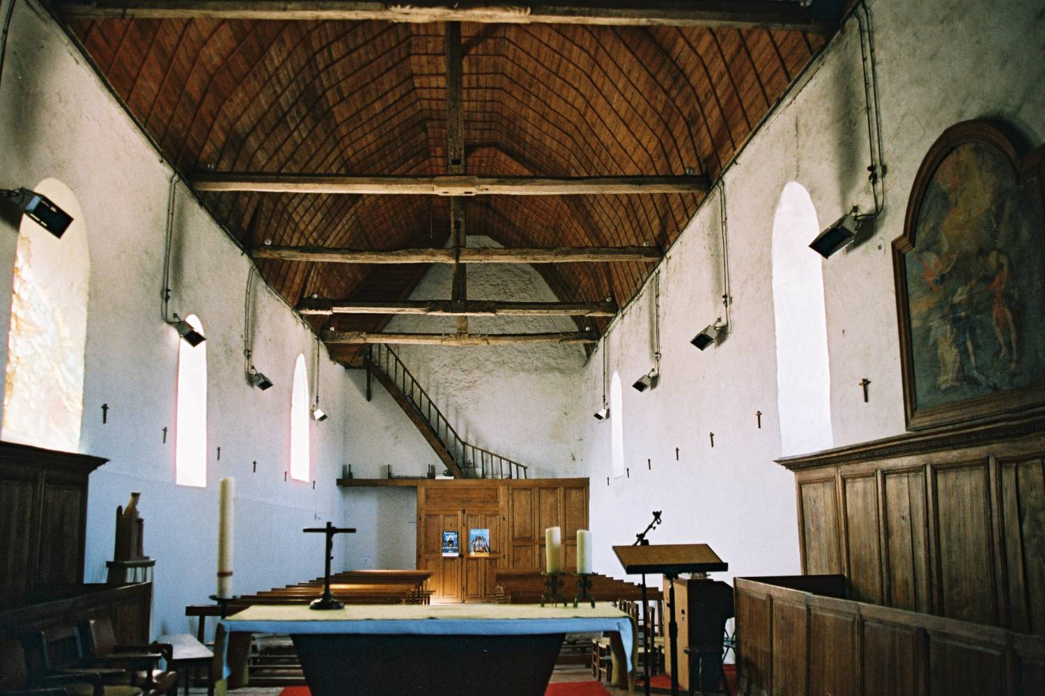 L’église est constituée d’une simple nef rectangulaire de 26m de longueur, 8m de large, avec un choeur à chevet plat. La toiture est en tuiles plates et le clocher est couvert d’ardoises.