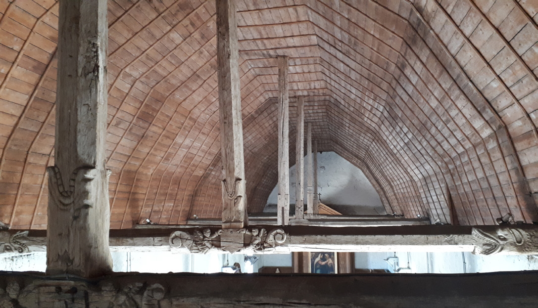 A l’intérieur, la voute lambrissée, supportée par une charpente sculptée, couvre l’ensemble de la nef. Les sculptures des entraits montrent à leurs extrémités des monstres (appelés également engoulants ou dévorants) et à leur jonction avec les poinçons se trouvent des blasons entourés d’allégories. Deux de ces blasons représentent la « chemisette ».