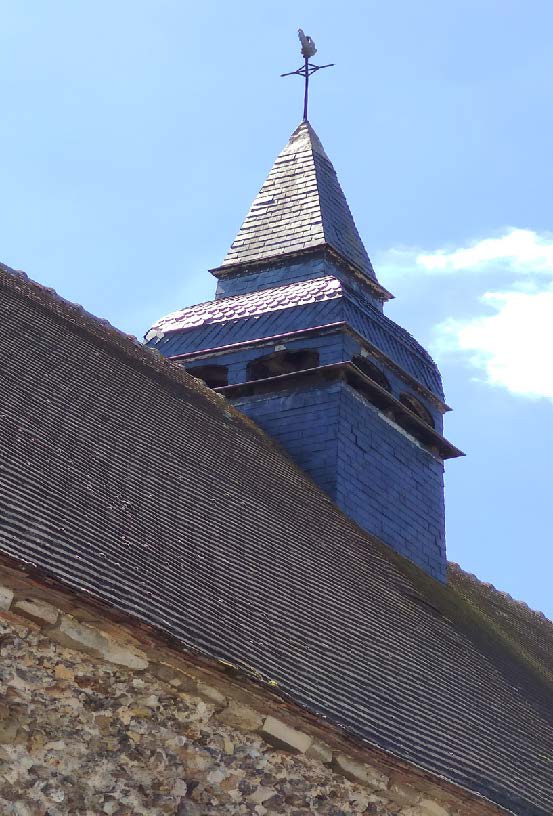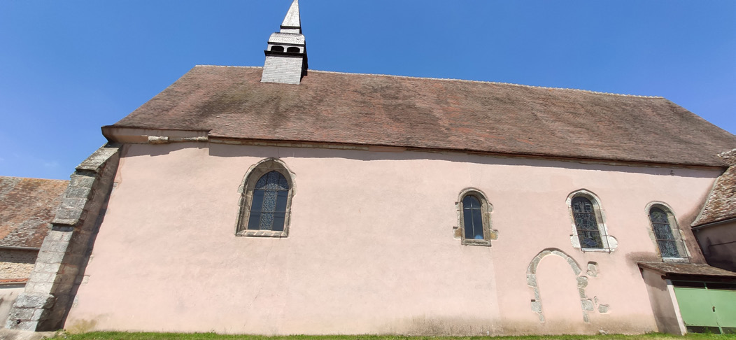 « L’église SAINT-HILAIRE est caractéristique des constructions romanes des XI-XIIème siècles. La charpente de la voûte atteste l’influence des Normands qui auraient occupé une grande partie de la région si l’on en juge par le style identique de nombreuses églises de cette partie de la Beauce. Elle fut agrandie au XVIème siècle et une grande partie du chœur, la façade, le clocher, quelques fenêtres ont dû être refaites car l’église avait grandement souffert de la Guerre de Cent ans. De cette période, il faut noter la belle charpente dont les entraits sculptés de dévorants (parmi lesquels une belle tête de chien), et certains portent sur un écu la chemisette, ou voile de la Vierge. » (d’après F.Geoffroy).