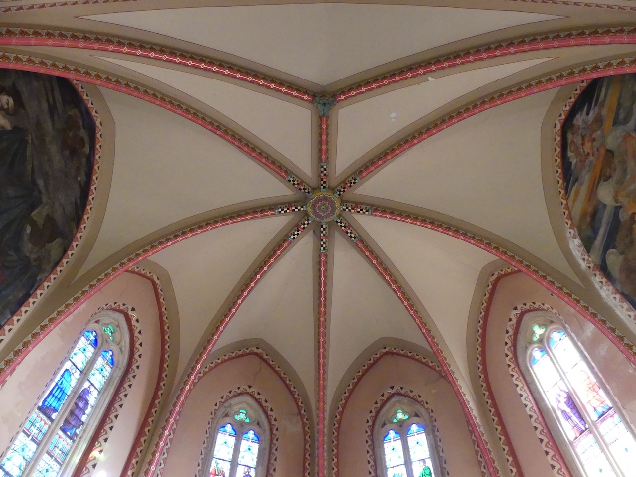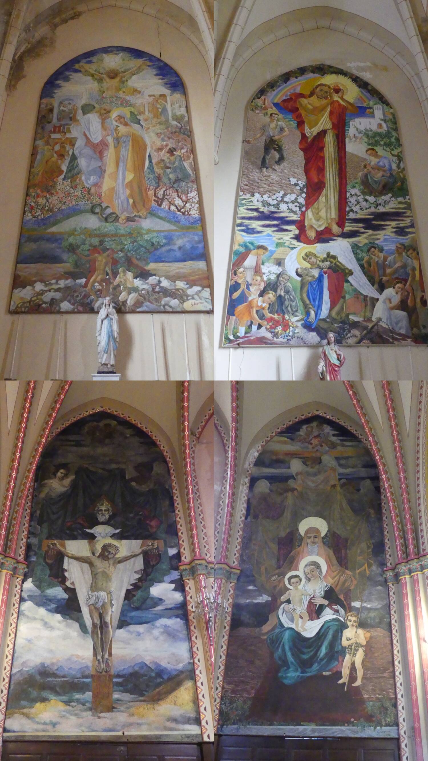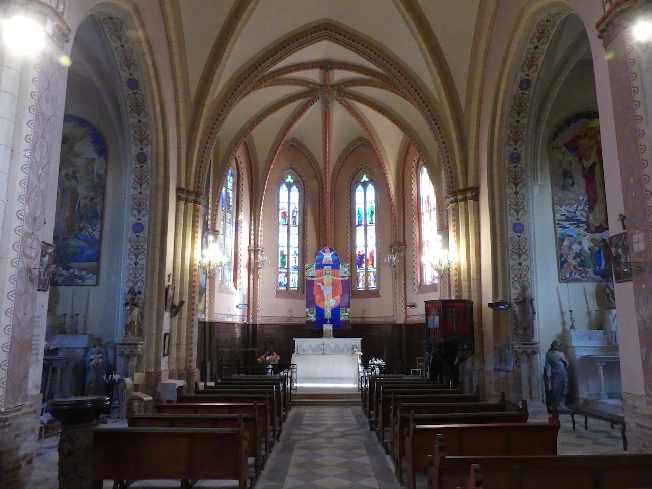L’église Saint-Laurent se compose d’une nef courte à une seule travée, prolongée par un large transept auquel sont accolées deux petites chapelles latérales, et d’une abside à pans coupés. Le chœur est encadré par deux sacristies, tandis qu’une remise est adossée au flanc sud de la nef. Le clocher, quant à lui, est implanté à l’ouest, directement accolé à la façade. L’appareillage mêle la brique, et le moellon. À l’intérieur, l’édifice est couvert de voûtes d’ogives, et percé de baies géminées éclairant la nef, les chapelles et le chœur. Le décor est enrichi par des peintures monumentales occupant le mur occidental, les chapelles latérales et la première travée du chœur, conférant à l’ensemble une forte unité esthétique.