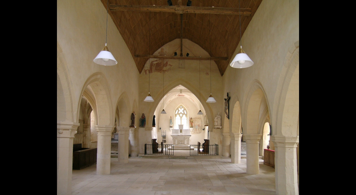 « La nef présente un seul étage. Les grandes arcades, en cintre légèrement brisé, sont formées d’un ou de deux rouleaux dont l’un biseauté. Elles reposent sur de courtes piles, alternativement circulaires et octogonales, couronnées de chapiteaux placés très bas, ornés de crochets ou de larges feuilles recourbées à leur extrémité ; les tailloirs sont profilés d’un bandeau et d’un cavet. Les bases des colonnes sont cachées sous le dallage qui a été relevé d’au moins un mètre. la première travée au nord est plus étroite avec un arc très aigu, parce qu’elle se trouve sous le clocher. Pour la même raison, le support est formé d’un massif rectangulaire flanqué de deux colonnes engagées à chapiteaux décorés de feuillages naturels : feuilles de chêne et de lierre. Un vaste parement complètement nu s’étend entre les arcades et le plafond qui couvre la nef. Il y a en effet environ trois mètres de différence de niveau entre ce plafond et les voûtes des bas-côtés.