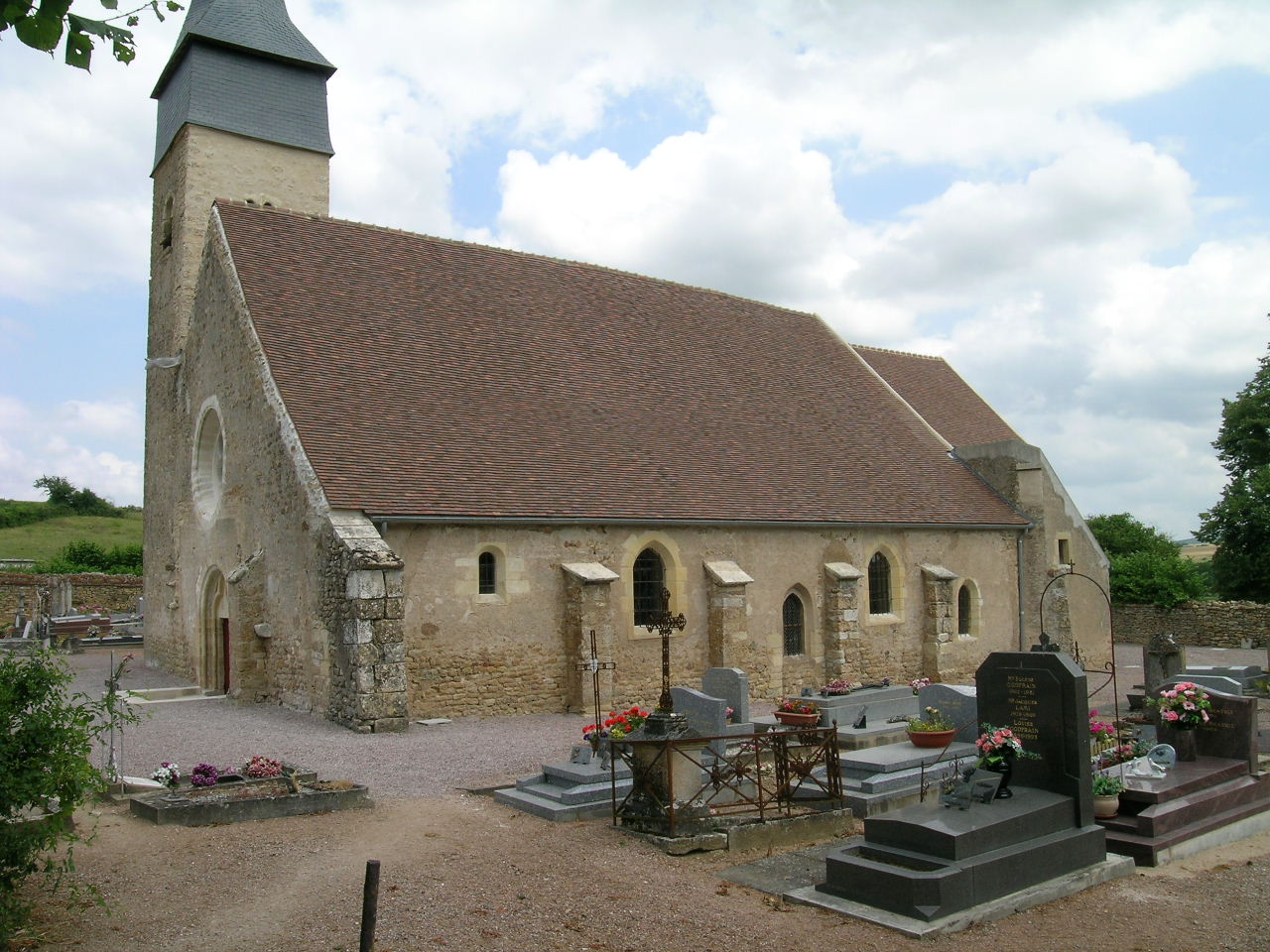 L’église, orientée, est dédiée à saint Loup. Elle a été bâtie au XIIIe s. et se compose d’une nef de cinq travées, flanquée de bas-côtés, et d’un chœur à chevet plat. Un petit porche couvert d’un toit en appentis abrite le portail en plein cintre. Le tympan est trilobé. Au milieu du mur-pignon s’ouvre un oculus. Une gargouille à tête de loup, correspondant au chêneau encaissé entre la toiture de la nef et le clocher, fait saillie à l’ouest.