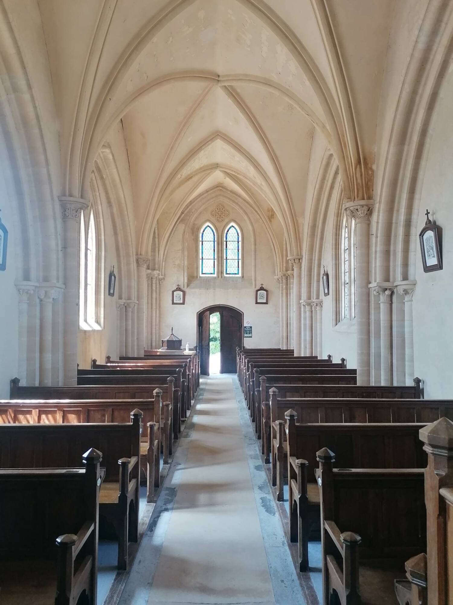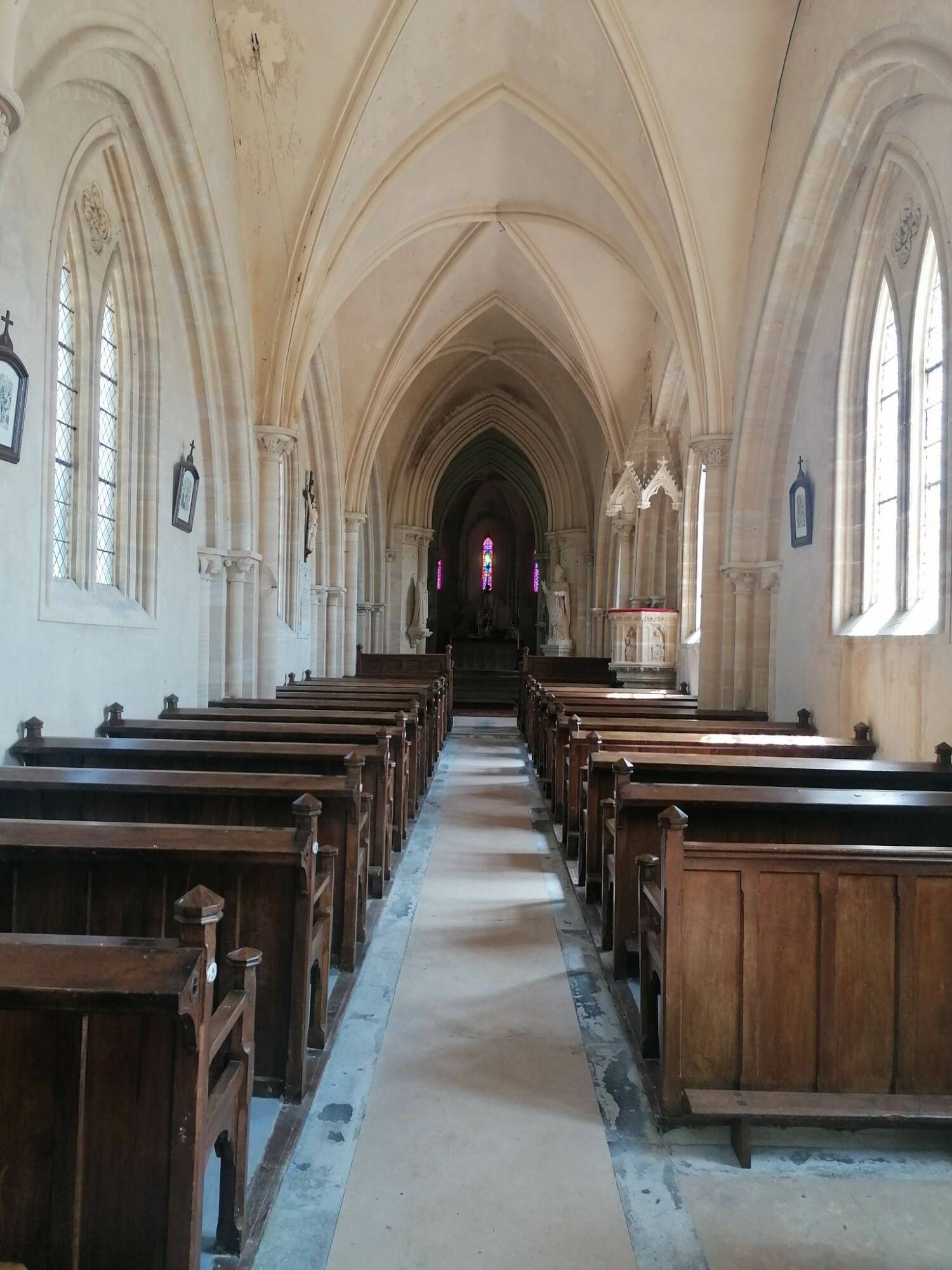 Un clocher s’élève au-dessus du choeur, sur deux niveaux : le premier est orné de contreforts ; le second de baies géminées.