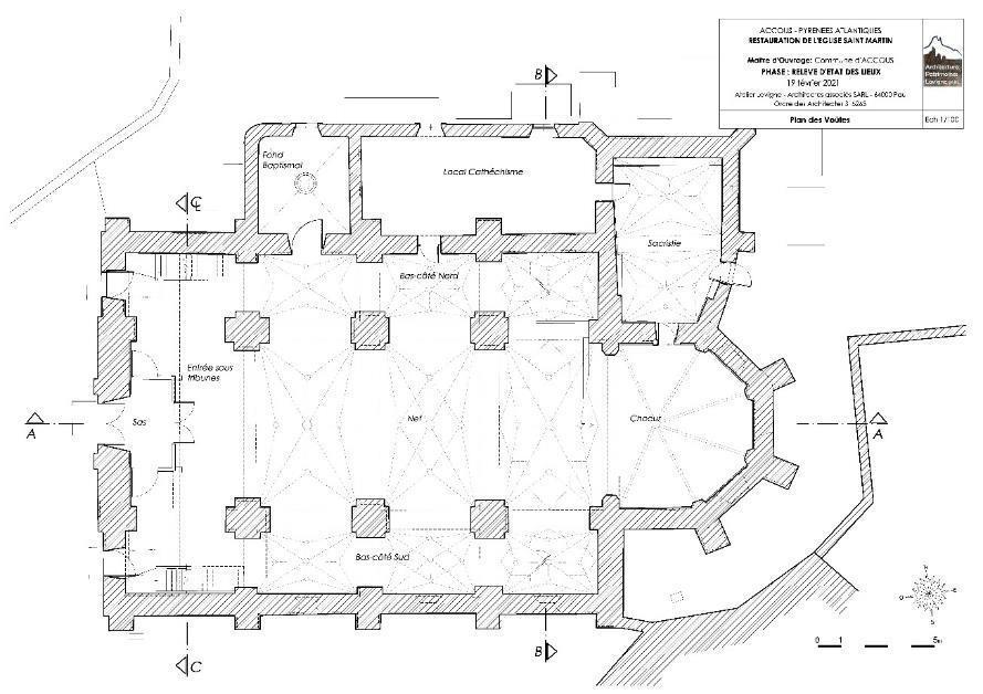 Composée d’une nef à 4 travées flanquée de deux collatéraux et terminé par une abside polygonale, l’église Saint Martin mesure 17.70m de long par 14.50m de large environ (dimensions intérieures, non compris la surlargeur du fond baptismal). La première travée, plafonnée par la tribune qui occupe tout l’étage, correspond à un agrandissement de l’église au XVIIIème siècle. Elle inclut le tambour d’entrée de l’édifice.