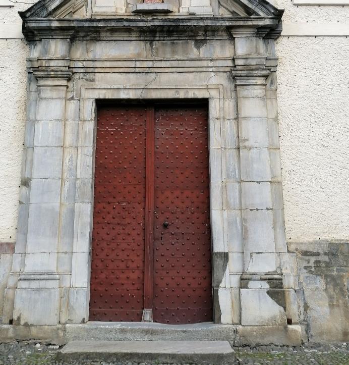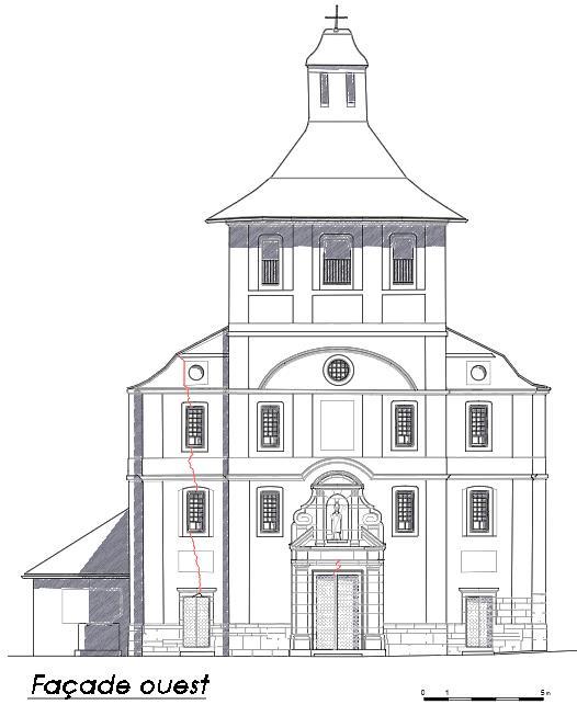 La façade Ouest diffère du style et de l’architecture très sobre du reste de l’édifice. Cette façade, début XVIIIème est composée de façon classique en cinq travées disposées en symétrie par rapport à l’axe de la façade. La façade est rythmée et divisée par un soubassement en pierre de taille calcaire grise (de hauteur asymétrique), de pilastres très légèrement saillant, enduits, des bandeaux d’étage et corniches moulurés en arc surbaissé. A l’exception des 3 portes dont les encadrements sont en pierre de taille les encadrements de l’ensemble des petites baies de la façade Ouest sont simplement enduits en légère surépaisseur. Ce constat d’un traitement qui ne semble pas tout à fait achevé est à recroiser avec la lecture des documents d’archives qui relate des difficultés de l’entreprise en charge des travaux. Le portail d’entrée entièrement bâti en pierre de taille calcaire marbrière grise a fait l’objet d’un travail plus soigné : entablement, pilastres, fronton brisé, ailerons à volutes rentrantes, fronton cintré, niche abritant la statue de Saint Martin.