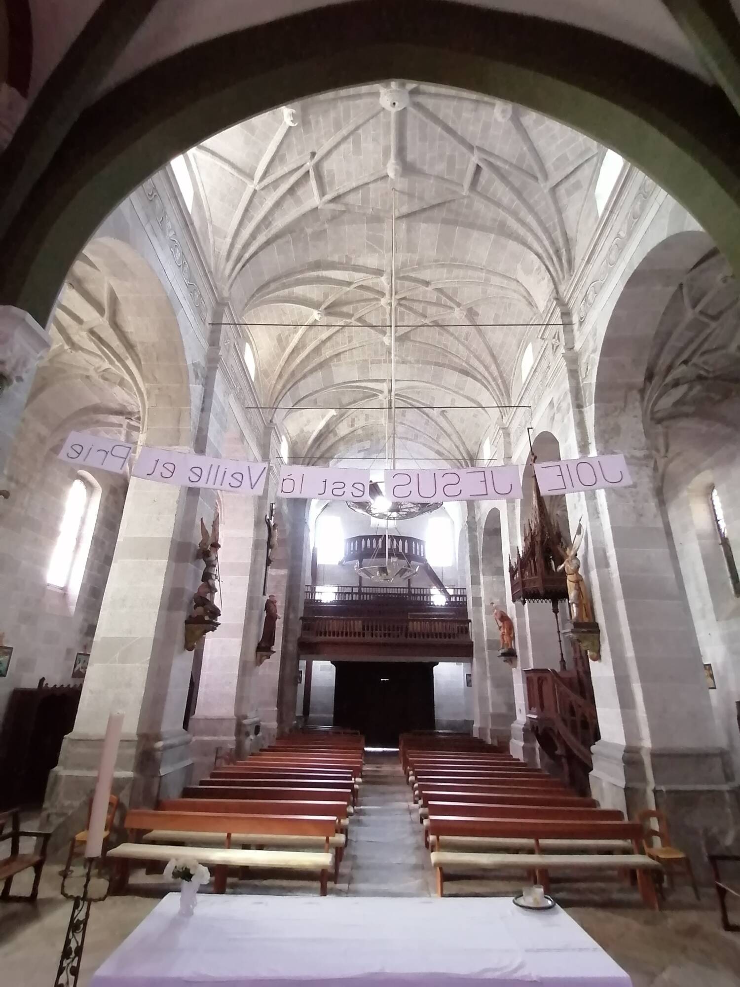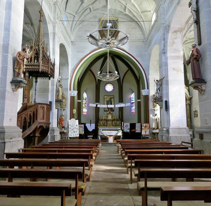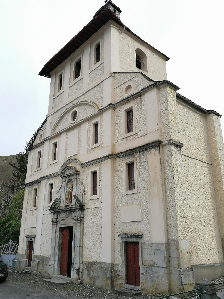 Reconstruite au XIVe s. il ne subsiste de cette période que le chœur et deux travées de la nef. Au début du XVIIIe s. l’église fut agrandie. Une nouvelle façade fut créée surmontée d’un clocher monumental. Au XIXe siècle furent ajoutés des fonts baptismaux et une salle de catéchisme.