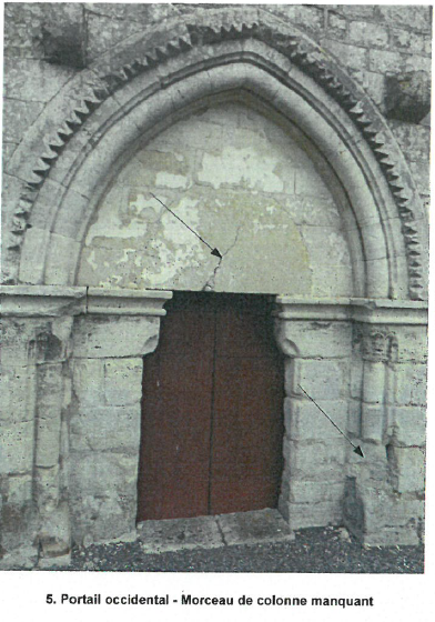 Le portail occidental présente, sous une archivolte à dents-de-scie, une voussure en arc brisée supportée par deux colonnes engagées.