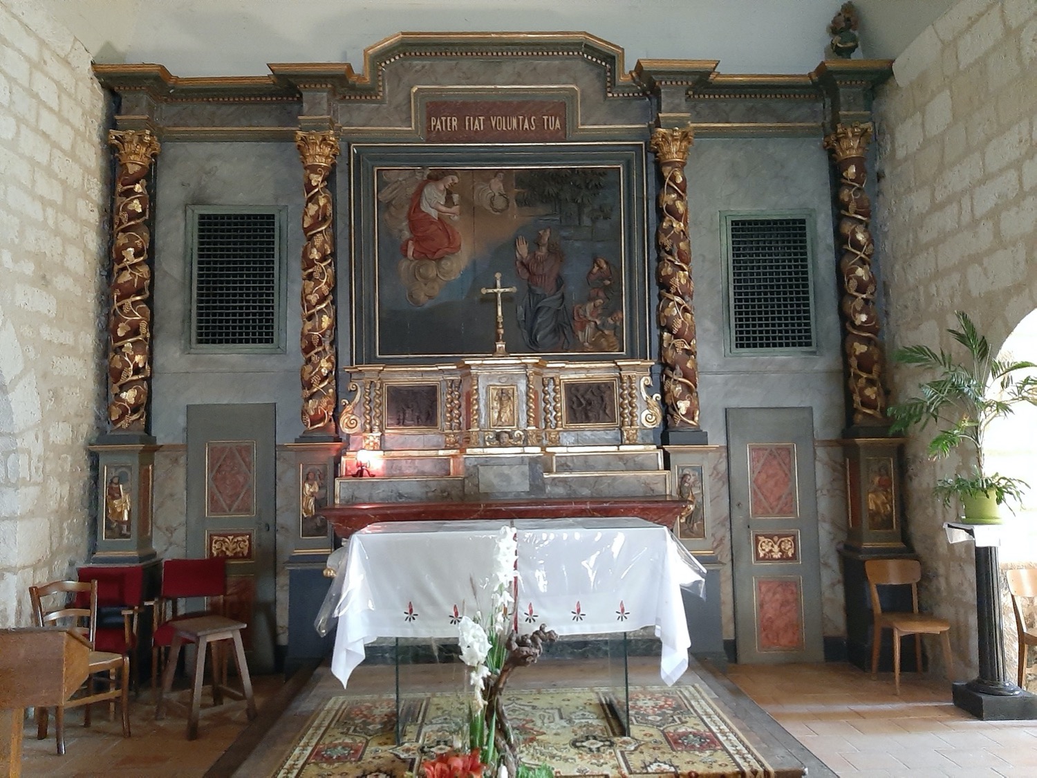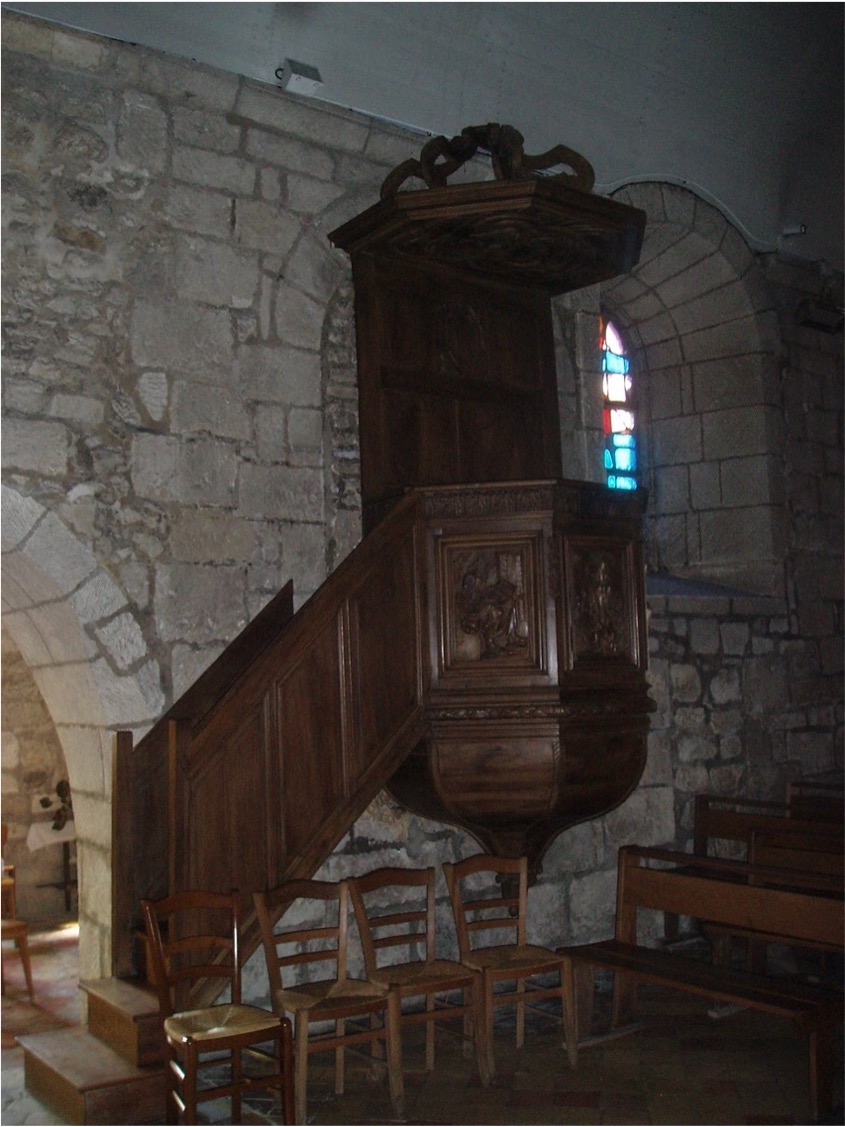 Le mobilier est quant à lui remarquable. Le chevet plat de l’élise est orné d’un retable de bois acquis en 1874 évoquant le style baroque de la contre-réforme. De son socle, s’élèvent 4 colonnes torses ornées, couronnées par un chapiteau corinthien. au centre, le retable est composé d’un bas relief. Son architecture a amené la DRAC à classer cet élément mobilier. L’ensemble a fait l’objet de restauration dans les années 1990 permettant au retable de retrouver son éclat d’origine. La chaire à prêcher datant de 1962 est également d’intérêt.