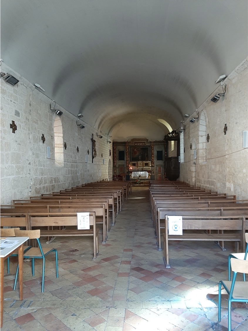 L’intérieur a un intérêt beaucoup plus marqué. La nef composée de ses deux petites chapelles, est éclairée par trois baies déterminant les travées.