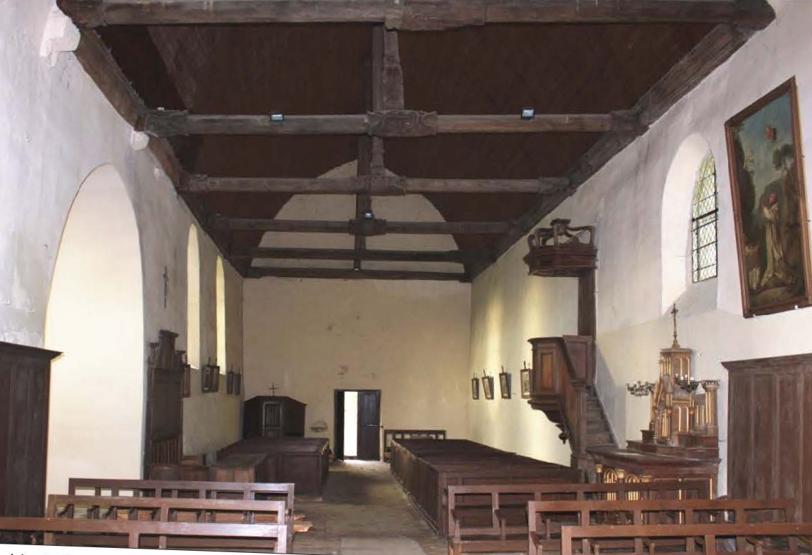 L’église Saint-Ouen est composé d’une nef unique terminée par un choeur à trois pans. L’intérieur est couvert par une voûte en planches laissant entraits et poinçons apparents. Les entraits comportent des parties sculptées au centre et aux extrémités. Un clocher est accolé à la nef. De forme massive sur plan carré, flanqué aux deux angles extérieurs de contreforts, et à l’angle nord-ouest d’un escalier en tourelle, il ne comporte qu’une petite baie sur chaque face, au dernier étage.