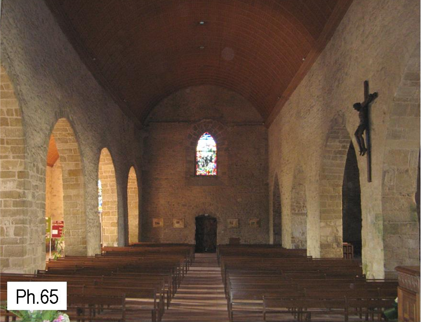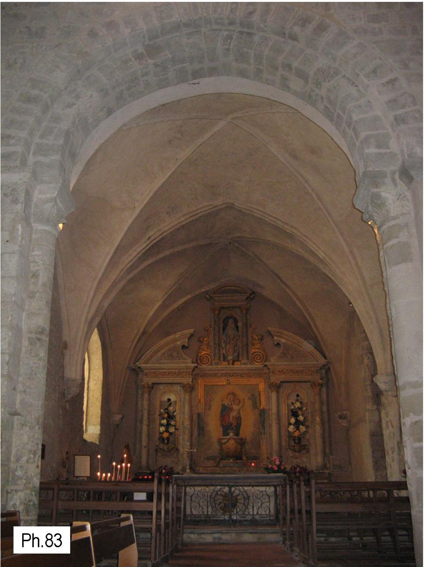 La nef est couverte d’une voûte lambrissée, le choeur d’une voûte en berceau et les bas-côtés de voûtes d’ogive.
