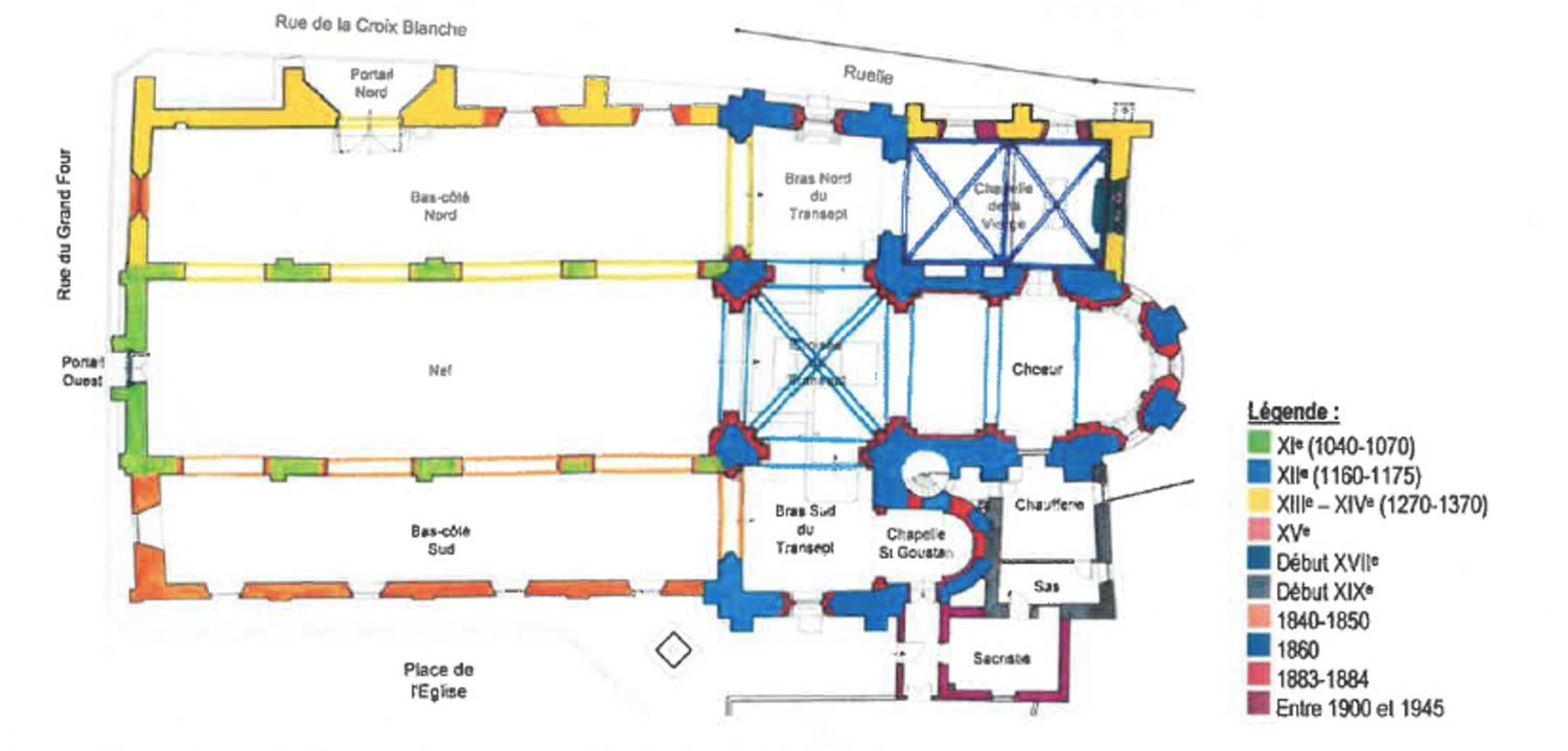 Au XIIème siècle, l’église prend la forme d’une croix latine avec l’ajout du transept, du chœur et de deux absidioles.