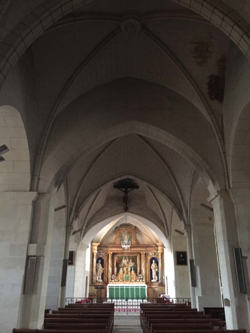 Saint-Pierre-ès-Liens est une église de forme paroissiale ou longitudinale en pierre de tuffeau qui se développe sur 3 vaisseaux et 5 travées. Elle est composée d’un vaisseau central et de deux collatéraux, d’un transept sur deux travées, dont la lecture spatiale n’est pas évidente de l’extérieur. Un arc triomphal (ancien au regard de la stéréotomie) sépare la nef du choeur et comporte en son point le plus haut un Christ en bois jaillissant d’une nuée avec en son centre un tétragramme, l’ensemble est peint en bleu et or. Le choeur est composé d’une voûte d’ogive quadripartite formée d’arcs et de formerets ayant perdu leur point d’appui.