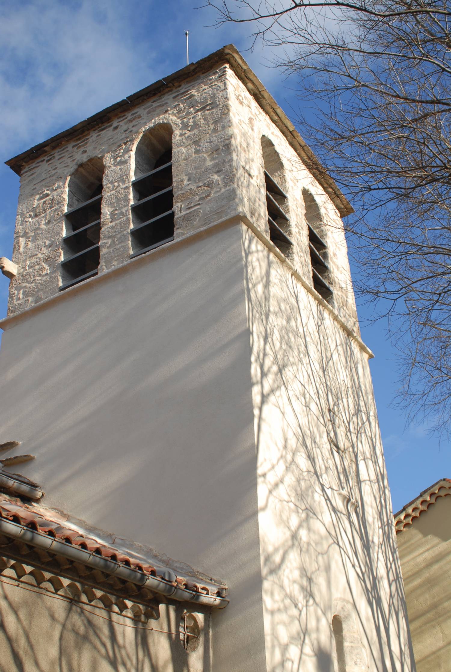 Le clocher au Sud, paraît assez massif par rapport au reste de l’église. Il est composé de trois niveaux. La chambre des cloches est ouverte par deux ouvertures sur chaque façade.