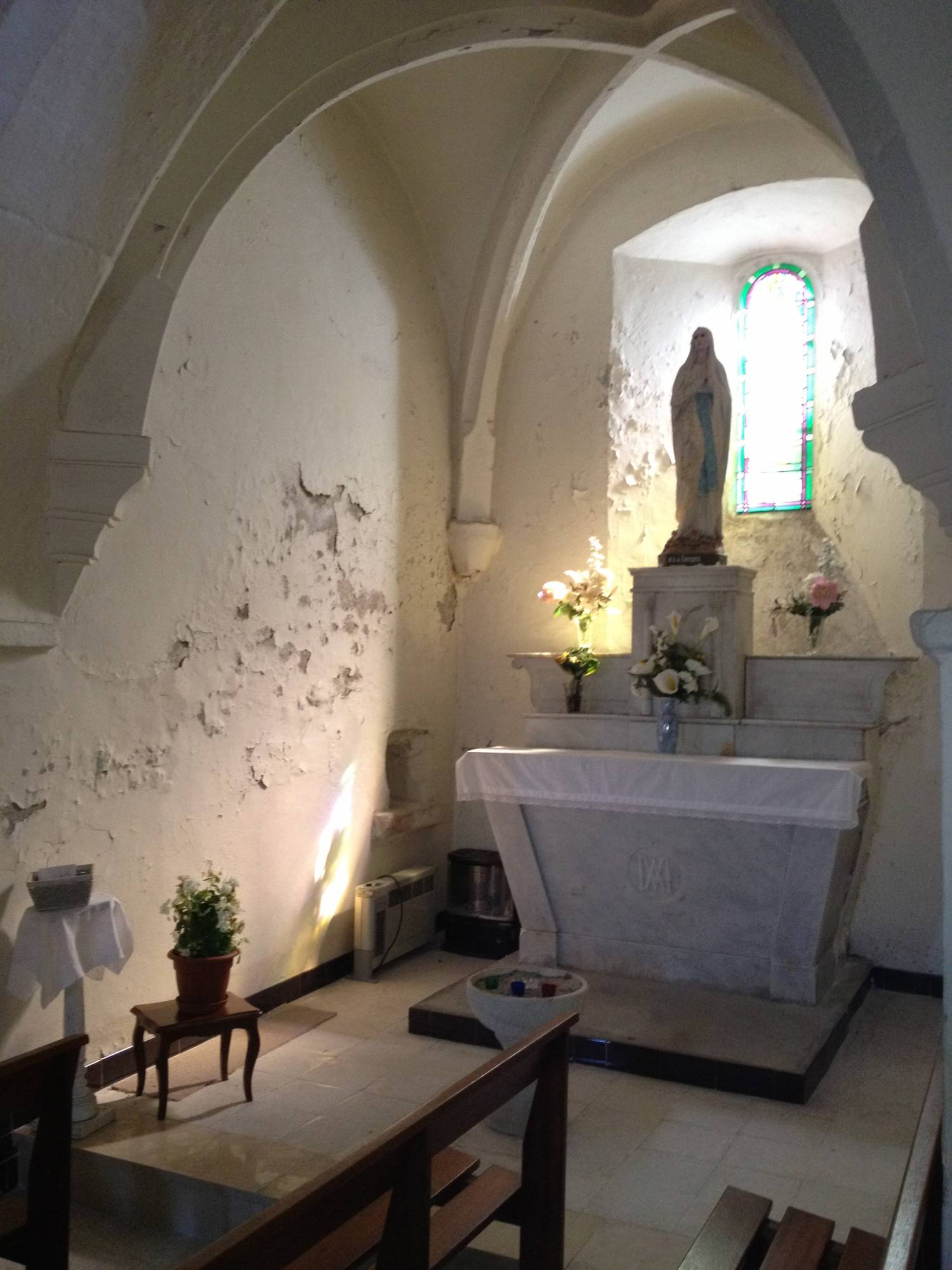 La chapelle de la Vierge, niveau inférieur du clocher est d’ailleurs traitée différemment par rapport au reste de l’église. Elle est caractérisée par une voute à croisement d’ogives. Elle est de style gothique. On peut penser à l’hypothèse d’une chapelle d’origine, dans une tour de guet, avec une pièce à l’étage.