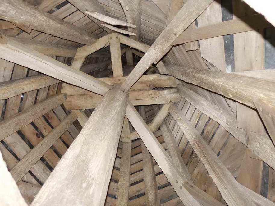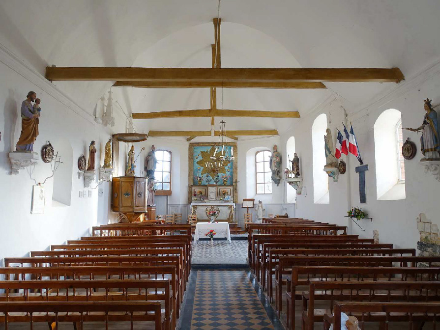 A l’intérieur, la nef à vaisseau unique est voûté en bois, recouvert d’enduit, avec entraits et poinçons apparents.