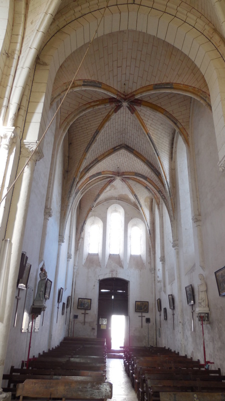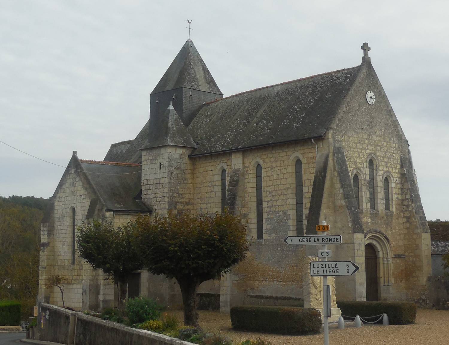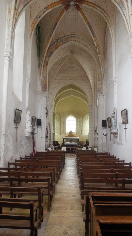 L’église est construite en moyen appareil de tuffeau, selon un plan en croix latine. La nef, longue de 13 mètres et large de 5, est constituée d’un vaisseau unique de deux travées oblongues, couvertes d’une voûte sexpartite à ogives moulurées en tore ; ce parti est rare en Touraine. La nef est éclairée au nord par trois baies en arc brisé, hautes et étroites, et par un triplet à l’ouest. Le côté sud est aveugle. Les retombées des ogives s’effectuent sur de petits chapiteaux sculptés portés par de fines colonnes engagées. Ces chapiteaux, aux corbeilles ornées de crochets et surmontées d’un tailloir sans décor, sont positionnés exactement à mi-hauteur entre le sol et les clés de voûtes qui s’élèvent à 4,5 mètres au-dessus des chapiteaux.