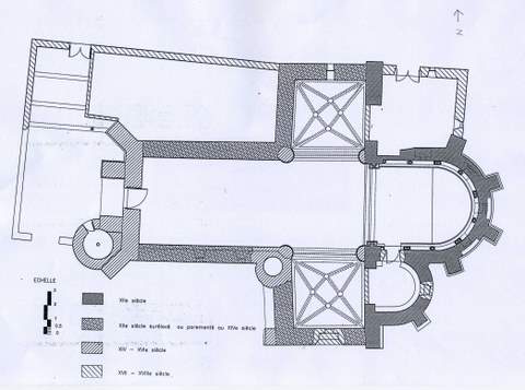 Il semble que l’église ancienne comportait une nef prolongée par une abside, un peu plus étroite, flanquée de deux absidioles qui ouvraient sur deux chapelles de plan carré, formant un faux transept.