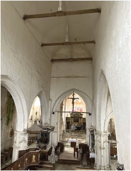 Le chœur entièrement voûté est composé d’une abside saillante à chevet plat flanquée de deux chapelles semi-circulaires. La nef, de même que ses bas-côtés, est voûtée de bois, et l’implantation irrégulière de ses piliers au décor Renaissance suggère d’importants travaux de reconstruction après les destructions dues à la guerre de Cent Ans. Le portail de la façade occidentale surmonté d’une grand baie à lancettes et oculus, malheureusement fermée par de la maçonnerie, a été refait au XVIIème s., avec l’introduction d’un arc surbaissé sous l’arc brisé primitif. Le clocher au-dessus du chœur semble lui aussi du XIVème s., mais ses baies ont été en partie bouchées et l’ensemble fortifié qu’il représente a fait l’objet de nombreuses reprises au XVème siècle.