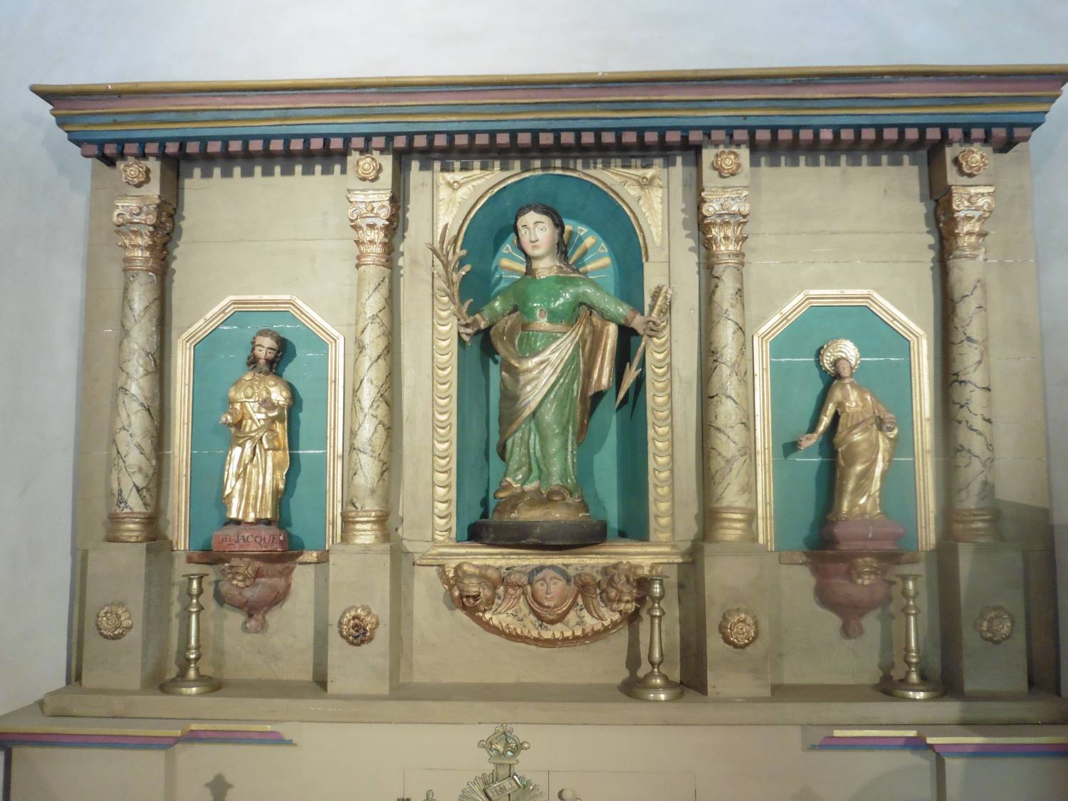 Pour tout mobilier, il présente un petit retable (remanié) en bois, trois niches pour trois statues, sainte Christine au centre, peut être la statue d’origine, saint Jacques et une autre martyre.
