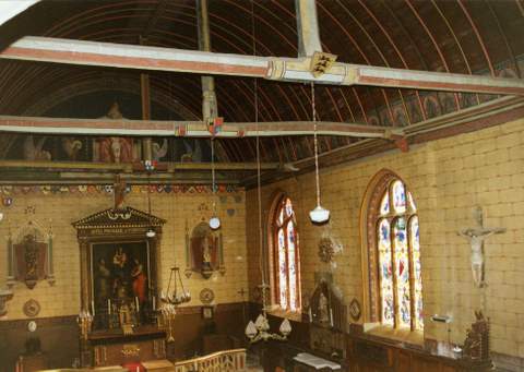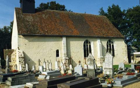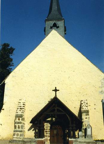 L’église paroissiale d’Escorpain, placée sous le vocable de saint Germain, est un édifice très simple, de plan rectangulaire et de dimensions modestes. A vaisseau unique, elle se termine par un chevet plat ; une sacristie est accolée au flanc nord du chœur ; le mur pignon de la façade est surmonté d’une flèche d’ardoises. L’église serait mentionnée dès le XIIe s. L’appareil de petits moellons, qui porte d’ailleurs la trace de nombreux remaniements, et les petites ouvertures, au nombre de trois dans le mur nord et d’une seule dans le mur sud, constituent les vestiges les plus anciens de cet édifice qui a été profondément restauré au XIXe s. C’est en effet à partir de 1886, grâce aux libéralités de la famille Firmin-Didot que l’édifice fut surélevé, comme en témoigne le mur-pignon de la façade. Le vaisseau fut alors couvert d’une voûte lambrissée, remplaçant la charpente précédente : l’inscription de 1886 fait état de campagnes de travaux antérieurs, au XVIIe s. notamment. Tout l’intérieur fut réaménagé, non d’ailleurs sans unit é, dans un goût néo gothique. Quant aux deux grandes baies du mur sud, vraisemblablement percées au XVIe s., elles ont été très remaniées lors de cette campagne. Pour la réfection des maçonneries extérieures, des enduits de la façade, des couvertures de la nef et d’un versant de la sacristie, la Sauvegarde de l’Art Français a octroyé à cette église non protégée une subvention de 80 000 F en 1994.