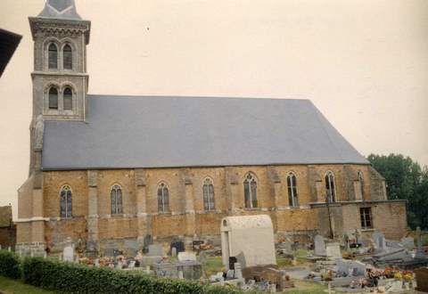 La première mention d’Espaubourg est la donation qu’en fit, vers 1095, le moine Renaud de Thourotte à l’abbaye de Saint-Germer, donation confirmée en 1152. L’église, dédiée à saint Martin, possède encore des fonts baptismaux en plomb, classés Monuments historiques, qui remontent à l’époque romane. Mais l’édifice actuel a été entièrement reconstruit au XVème s. et consacré le 29 mars 1541. Sa construction en brique est typique de la région. La pierre est utilisée seulement pour certains soubassements ou chaînages et pour les remplages des dix-neuf fenêtres de la nef et du chœur à cinq pans. Ces ouvertures avaient des vitraux qui, au début du XIXème s., faisaient l’admiration de Jacques Cambry. Il ne subsiste aujourd’hui que deux verrières du chœur, la troisième ayant été volée en 1967, les parties supérieures de deux fenêtres sud et un fragment dans une fenêtre au nord. A l’origine, le clocher s’élevait au centre de la nef. C’était une pyramide couverte d’ardoises. Reconstruit en 1868, il s’écroula l’année suivante, « ensevelissant sous ses ruines le porche, la nef et son mobilier ». Les années 1870, 1871 et 1872 furent consacrées à la construction d’une nouvelle façade et d’un clocher à l’ouest, à la réfection du lambris qui fut sans doute couvert en plâtre à ce moment et à la construction d’une sacristie. Pour la reprise de maçonneries et les remplages de certaines baies, la Sauvegarde de l’Art Français a accordé une subvention de 70 000 F en 1995.