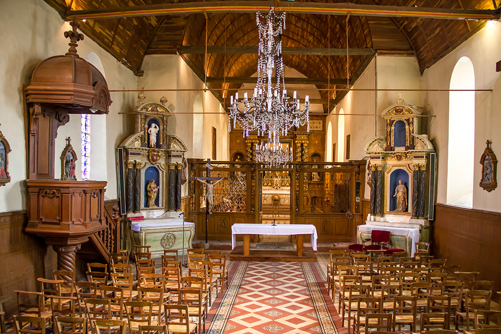 Au mur sud du choeur, à chevet plat, est accolé la sacristie et au mur sud de la nef, la chambre des charitons. L’accès se fait par par l’ouest, au côté nord, par un porche ouvert. La nef est couverte d’une charpente lambrissée. Les toits sont en ardoises et les murs en moellons enduits.