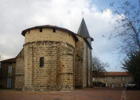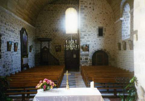 La nef rectangulaire, à vaisseau unique très remanié au XIXème s., est prolongée, sans grande régularité, par un chœur carré terminé par une abside semi-circulaire voûtée en cul-de-four. A l’extérieur le chevet est heptagonal ; il a été surélevé au cours de la guerre de Cent Ans pour aménager un refuge défensif au-dessus de la corniche ancienne à modillons sculptés. Quatre contreforts massifs de cette époque tardive alternent avec les contreforts d’origine plus fins, semblables à ceux de la nef. Les travaux de 1995 et 1996 ont permis de découvrir dans les deux plus gros contreforts, chargés d’assurer la cohérence entre la nef et le chœur, deux absidioles, depuis mises en valeur, dont l’une contenait une table d’autel médiévale, les restes d’un suaire et un chandelier du XIIème siècle.