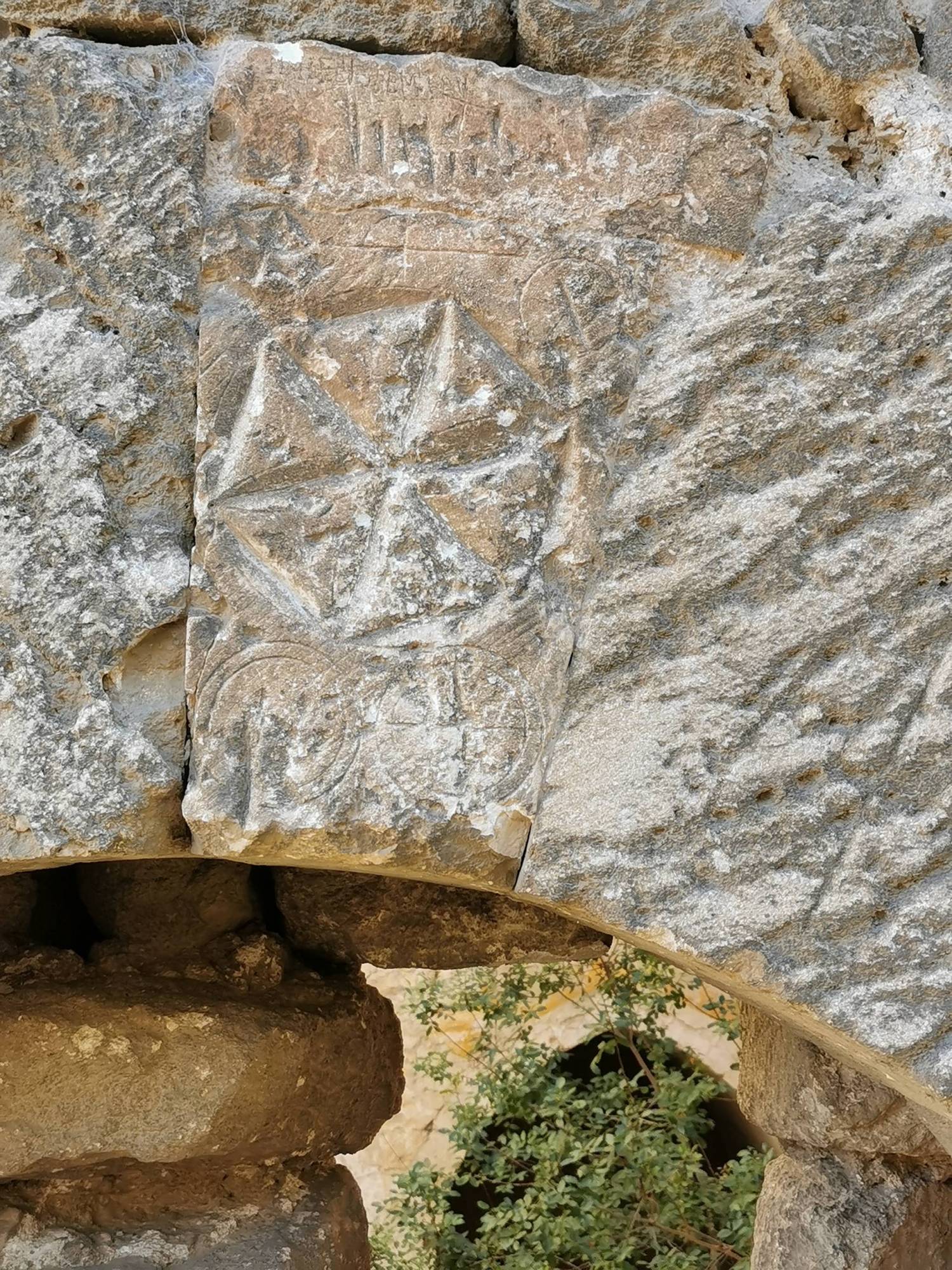 Au nord, des fouilles clandestines anciennes ont mis en évidence les restes d’un avant-corps dans lequel il est possible d’identifier un porche abritant une entrée aujourd’hui murée.