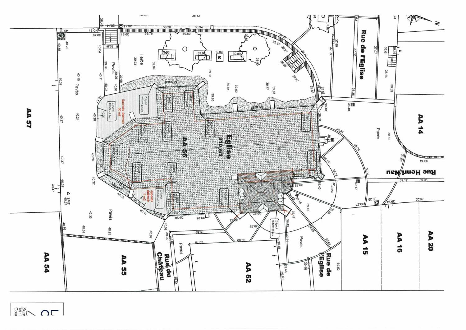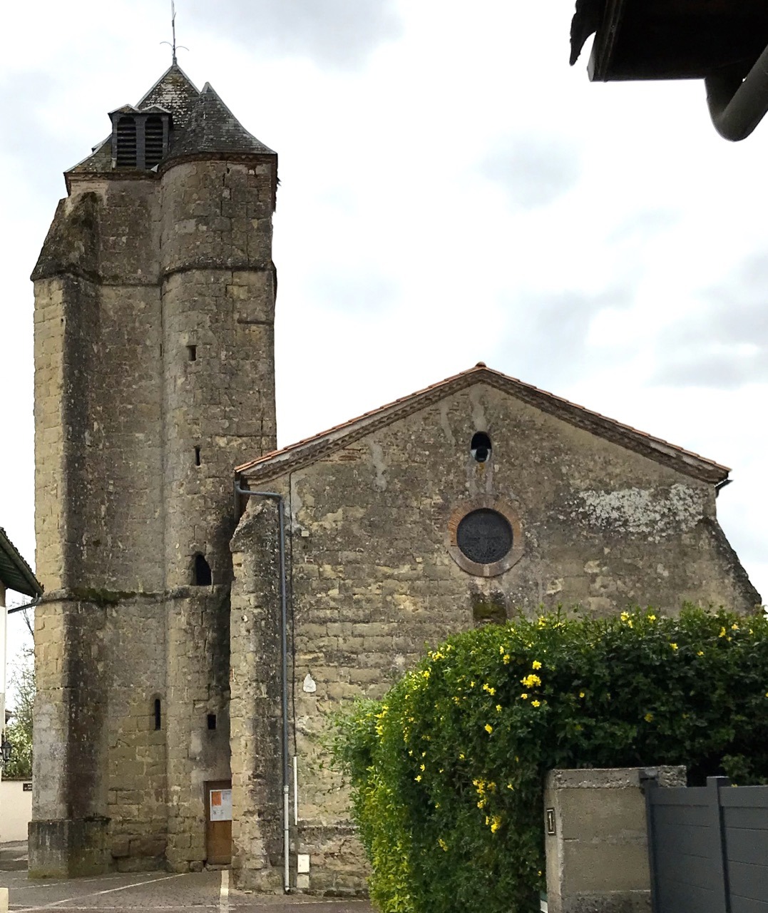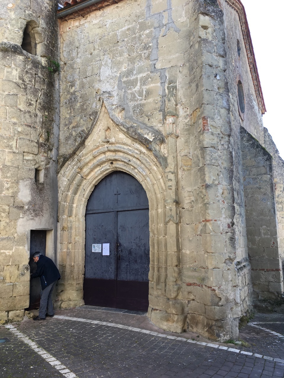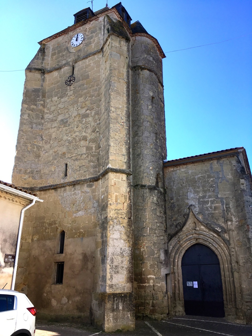 La porte d’entrée de la tour donne accès à un escalier de pierre en colimaçon (75 marches) qui permet de monter jusqu’au clocher. La porte d’entrée de l’église, avec un bel encadrement en pierres de taille sculptées, se trouve à côté de la tour, sur la façade Nord, Nord-Est .