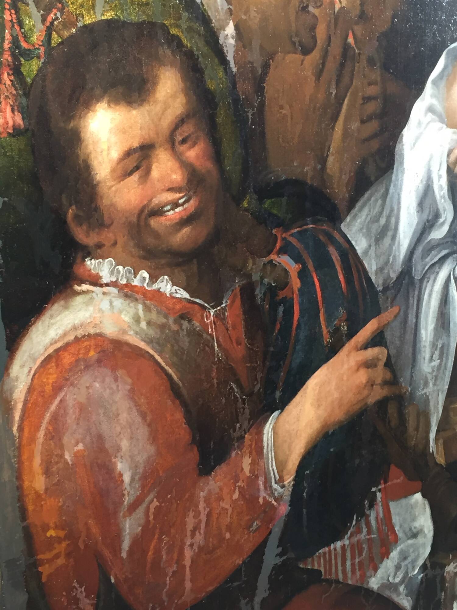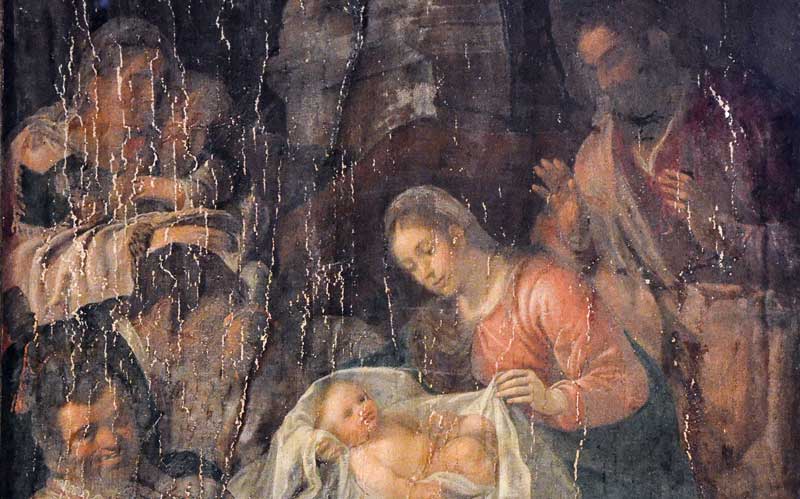 C’est la venue des bergers auprès de l’enfant Jésus que Juan de Roelas a ici peint avec une extrême douceur et tendresse. Tous les regards sont posés sur le nouveau né, à l’exception du berger sur la gauche qui regarde le spectateur en souriant, le doigt pointé vers l’enfant comme pour lui indiquer sa présence. D’une grande qualité dans le style et la composition, nous avions été saisi par l’état particulièrement critique de L’adoration des bergers. Certainement dû à l’effet du temps, les couleurs étaient devenues très ternes et une légère couche blanche recouvrait l’ensemble de la peinture. Il était évident que le tableau devait retrouver son éclat d’antan, qui souligne à nouveau toute la douceur de la scène. Aussi sur la partie gauche, la couche picturale s‘effritait créant des craquelures et des pertes de matière qu’il était urgent de combler. A plusieurs endroits des boursoufflures pouvaient être observées sur la toile. A cela s’ajoutait un détachement de la toile de son cadre, créant des plis qui auraient pu lui être fatals. Il était temps pour ce magnifique tableau de retrouver tout l’éclat et la dignité qui sont les siennes, avant qu’il ne soit trop tard !