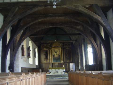 On accède à l’intérieur de l’édifice sous un large porche en bois, par deux portes séparées par un contrefort. Le volume unique de la nef, aux murs enduits, est couvert sur trois travées d’une voûte lambrissée du XVIes. en berceau brisé, à forts couvre-joints, sablières moulurées et entraits à poinçons bagués. Les deux travées orientales sont occupées par la charpente du clocher s’appuyant de chaque côté sur des poteaux à aisseliers. Le chœur présente un couvrement identique, de même que la chapelle du Rosaire. Celle-ci est éclairée en partie sud par les deux larges baies à remplage citées plus haut, comprenant pour l’une d’elles une verrière du XVIes. (saint Éloi, Vierge à l’Enfant, avec donatrice agenouillée) restaurée en 1888 par l’atelier Duhamel-Marette. Une tourelle d’escalier à vis, située à la jonction du choeur et de la nef, donne accès au clocher, à charpente à trois enrayures.
