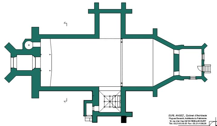 Mais c’est l’ancienne chapelle seigneuriale, au sud, qui retient toute l’attention. Vraisemblablement construite à la fin du XVe s. et dotée de murs épais, percés de petites fenêtres en tiers-point, elle possède une superbe voûte dotée de liernes, de tiercerons et de nervures complémentaires, chargées de clés historiées : au centre, le Christ accompagné de la Vierge et de saint Jean ; au croisement des liernes et des tiercerons, des scènes de la Passion (le baiser de Judas, la Flagellation, le Couronnement d’épines, le Portement de Croix) ; au tiers des nervures principales, des anges portant les armoiries des familles de la Viefville, de Griboval, de Saveuse et Quiéret ; sur les culots, saint Michel terrassant le dragon, sainte Véronique et son voile, saint Eustache (?) entouré de bêtes féroces, une femme et un démon particulièrement grimaçant.