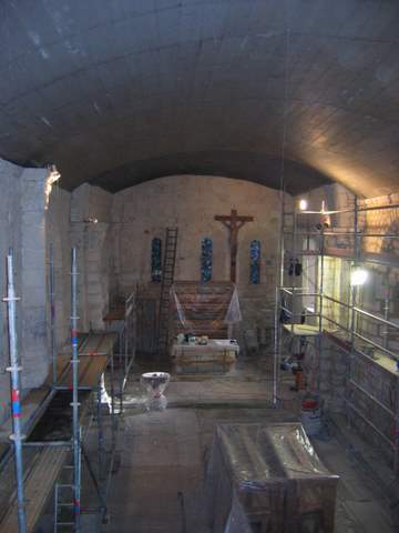 Voûtes et doubleaux ont disparu, remplacés par un plafond de bois, et une tribune, soutenue par des colonnes toscanes en bois, peintes en faux-marbre, occupe le revers de la façade occidentale. La suppression de deux des contreforts du mur gouttereau nord de la nef, n’entraîna pas de désordres trop importants et la construction, au cours du XIXe s., d’une sacristie au nord du chœur vint, dans une certaine mesure compenser leur disparition. Du côté sud, deux des contreforts, longtemps colonisés par le lierre, ont été, lors de récents travaux de restauration, déposés et remontés.