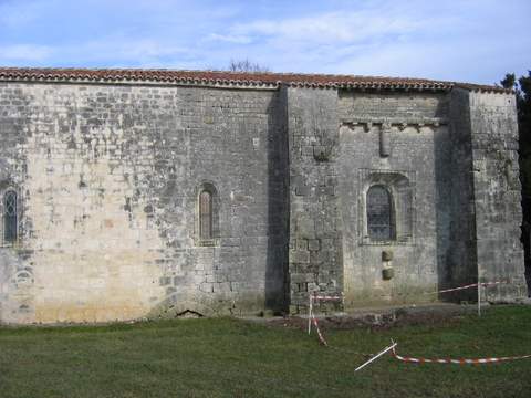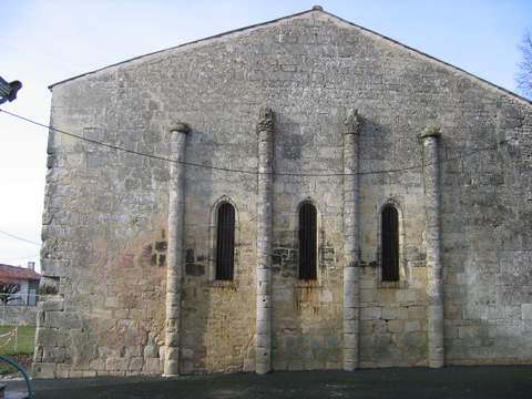 La façade est, en effet, caractérisée par la présence, au-dessus d’un portail en plein cintre à triple voussure, d’un certain nombre d’éléments sculptés : à gauche, une figure du Christ assis, acéphale et privée de ses bras, placée à l’intérieur d’une mandorle dont la partie inférieure a disparu ; au même niveau, et pratiquement dans l’axe de la porte, douze petits personnages assis, acéphales eux aussi, sont alignés dans un enfoncement assez profond dont la partie supérieure est constituée par une suite de douze petits arcs ; comme chacun des personnages porte sur ses genoux une sorte de tablette, l’ensemble a été interprété comme une représentation de la Cène. Plus haut, à droite, un autre enfoncement rectangulaire abrite les restes de quatre figures ; les deux premières, en partant de la gauche, de même que la quatrième, pourraient être féminines ; cette dernière, ainsi que la troisième, étaient probablement représentées assises ; on a lu à côté de ces personnages, les mots «Virgo » et « Iosef ». Au même niveau, mais à gauche, touchant presque la partie supérieure de la mandorle déjà mentionnée, un lion ailé, en assez fort relief, peut-être, en dépit de ses mutilations, interprété comme le symbole de l’évangéliste Marc ; enfin, presque au sommet du contrefort nord, a été insérée une petite tête, plus animale qu’humaine. Une hypothèse récurrente veut que ces sculptures proviennent de l’ancienne église paroissiale, située au hameau tout proche de Saint-Maixent (déformation de Maximien ?) dont quelques vestiges (chapiteaux et modillons) ont été signalés mais sans localisation précise et ne semblent plus repérables. Une tradition locale affirme par ailleurs que la mutilation des figures est le résultat d’une «expédition justicière» menée en 1832, par la Garde nationale de Gicq (Charente-Maritime) à l’encontre des habitants de Fontaine-Chalendray.
