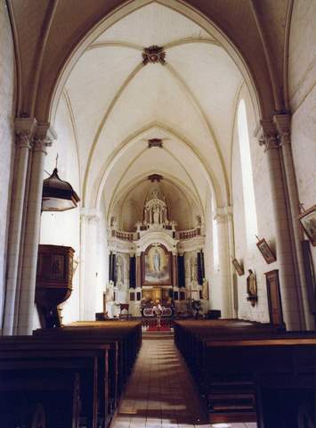 L’église Notre-Dame a été fondée au milieu du XIIème s. comme chapelle du château fort, aujourd’hui disparu ; desservie par un prieur nommé par l’Abbé de Toussaint à Angers, elle servit dès l’origine d’église paroissiale. Construite en bel appareil de pierre de tuffeau, elle comporte une nef unique, d’une grande longueur (30 m), qui se termine par une abside polygonale. La voûte d’origine a été remplacée au XIXème s. par une voûte gothique, beaucoup plus haute, et ayant obligé à rehausser le toit, ce qui donne à l’intérieur un aspect élancé conforme au style gothique de l’ouest. Seules demeurent les deux ouvertures primitives de la première travée, toutes les autres ayant été refaites et élargies en 1866. À l’intérieur, l’abside est garnie d’un grand retable en pierre, orné de colonnes en marbres polychromes, tels qu’on en trouve dans nombre d’églises de la région . La deuxième travée de la nef est flanquée, au sud, d’une tour carrée dont la base semble contemporaine des parties les plus anciennes de l’édifice, alors que le couronnement a été reconstruit au XVIIème s. Vers 1550, le portail occidental d’origine a été condamné et une porte percée sur le mur sud de la tour ; largement ornée de sculptures, elle est surmontée d’une grande baie au fenestrage classique. La commune de Fontaine-Milon s’intéresse de près à l’état de son église, reconstruisant en particulier, en 1992, la toiture sur ses seuls deniers. Pour aider à la restauration de la tour, dont les sculptures en tuffeau étaient fortement dégradées, la Sauvegarde de l’Art Français a accordé en 1993 une aide de 50 000 F.