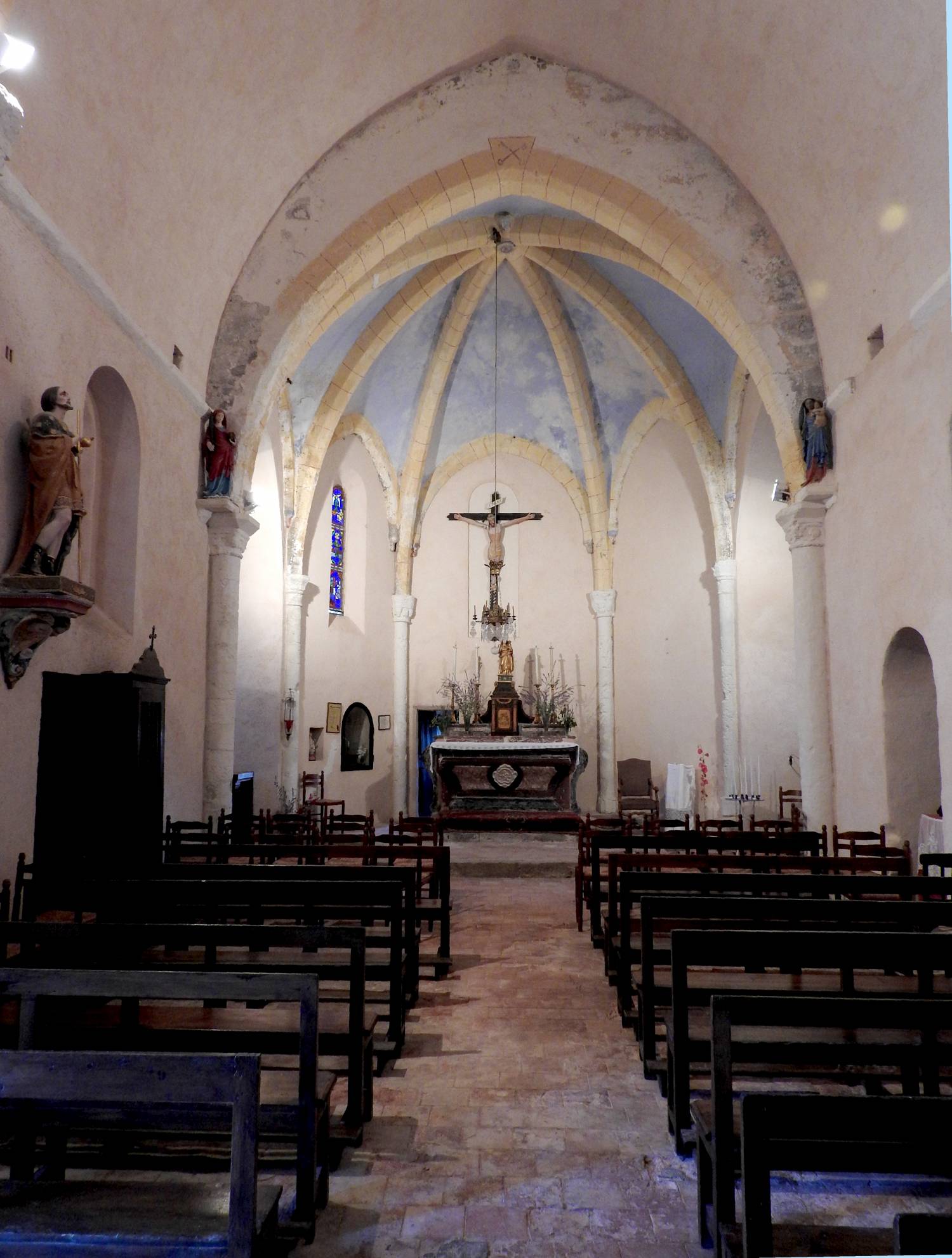 L’édifice se compose d’une nef romane voûtée en berceau brisé appareillé. Les deux travées de la nef sont séparées par un arc doubleau de profil rectangulaire, reposant sur des piliers demi-circulaires engagés. Les chapiteaux sont cantonnés de têtes d’angle très saillantes, la corbeille garnie de feuillages très simples.