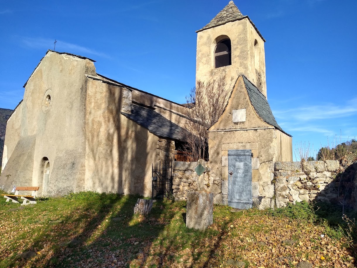 L’édifice n’est ni classé, ni inscrit. Il est de tradition romane. Il mesure 21 m de long : une nef couverte par un berceau plein cintre reposant sur deux doubleaux ouvre sur deux chapelles au nord (2e et 3e travées) et une au sud (2e travée), également voûtées de berceaux en plein cintre ; elle se termine à l’est par une abside voûtée en cul-de-four. Au sud, elle est dominée par un massif et pittoresque clocher. L’ensemble de l’édifice est couvert en lauzes. L’intérieur est enduit à la chaux masquant par endroits des peintures du XVIIIe s. Il abrite un intéressant mobilier dont plusieurs éléments sont classés.