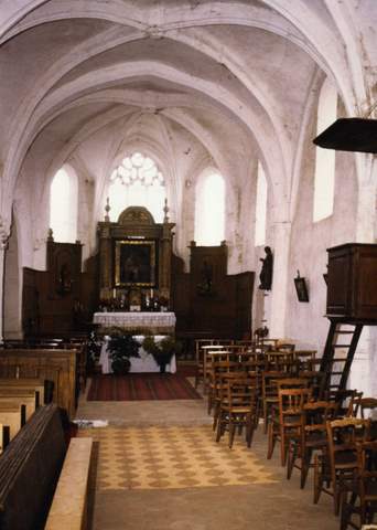 L’église Saint-Saturnin était encore au XVIIème s, sous le vocable de L’Exaltation de la Sainte-Croix car le village dépendait de Sainte-Croix d’Orléans. On sait que des travaux importants y furent faits au début du XVIème s. (la date 1521 figure sur un décor de l’abside). En outre, un curé est dit « avoir rebâti » l’église en 1703. Il faut sans doute comprendre « avoir restauré ». Cette église se compose d’une nef de quatre travées et d’un bas-côté à gauche. Une fenêtre au remplage flamboyant éclaire le chœur et l’ensemble est voûté d’ogives tardives, probablement du XVIème s. Extérieurement, les murs de la nef (côté droit) et de l’abside à trois pans sont renforcés de contreforts placés régulièrement. Le clocher se trouve à l’extrémité sud-ouest de l’église, sur la première travée ; c’est une tour carrée à toit pyramidal élancé, le toit est recouvert d’ardoises. À l’intérieur, on remarque un grand nombre de culs-de-lampe ornés de têtes très diverses. Parmi le mobilier, on note principalement: un retable et des statues du XVIIème s., ainsi que des dalles funéraires très anciennes. Pour l’étaiement, la Sauvegarde de l’Art Français a donné 40 000 F en 1992.