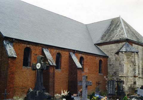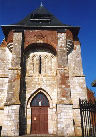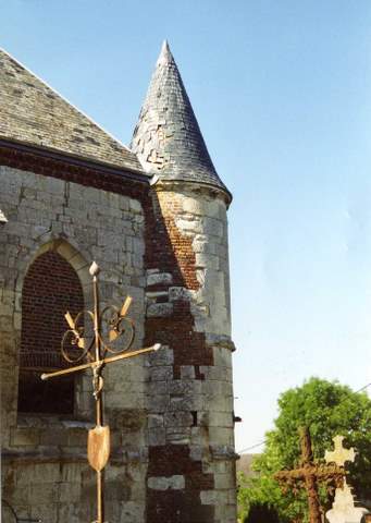 Ses ébrasements à ressauts sont ornés de trois colon nettes baguées qui reçoivent une archivolte richement moulurée. La tour-porche remonte, au moins dans ses parties basses, au XIIIe siècle. Elle se compose d’un premier niveau voûté d’ogives pro filées en amande, qui fait office de porche. L’arcade en arc brisé à arêtes vives qui en perce le mur ouest, est surmontée d’une succession de cinq arcatures aveugles très étroites prises sous un arc de décharge. Ces deux niveaux sont flanqués de puissants contreforts cruciformes en pierre de taille sur lesquels se posent des tourelles en quart de cercle en encorbellement ; la partie supérieure de celles-ci, comme celle de l’ensemble du clocher, est en briques, ce qui traduit une phase de travaux des XVIe ou XVIIe s., ce matériau étant alors particulièrement répandu en Thiérache.