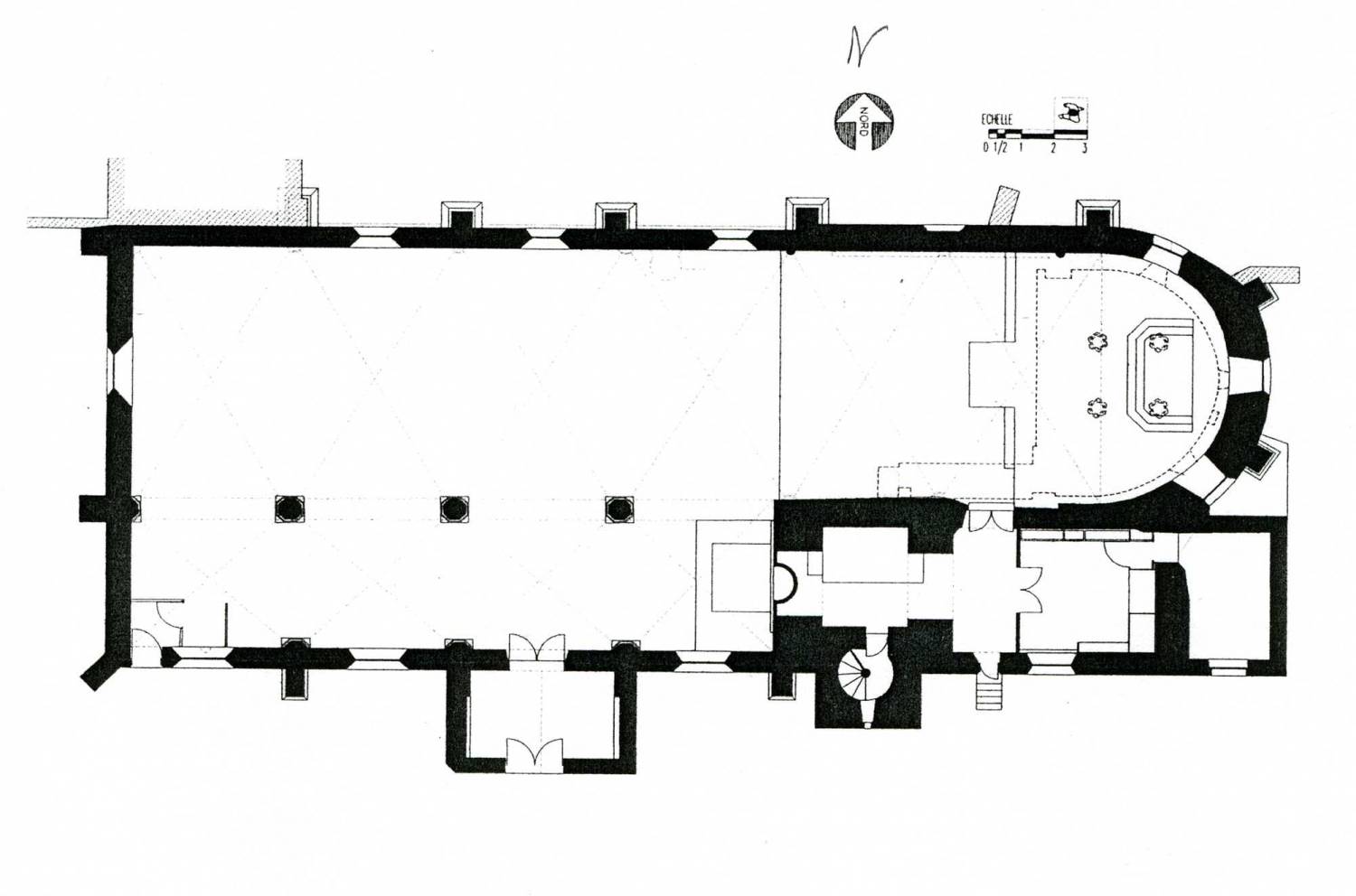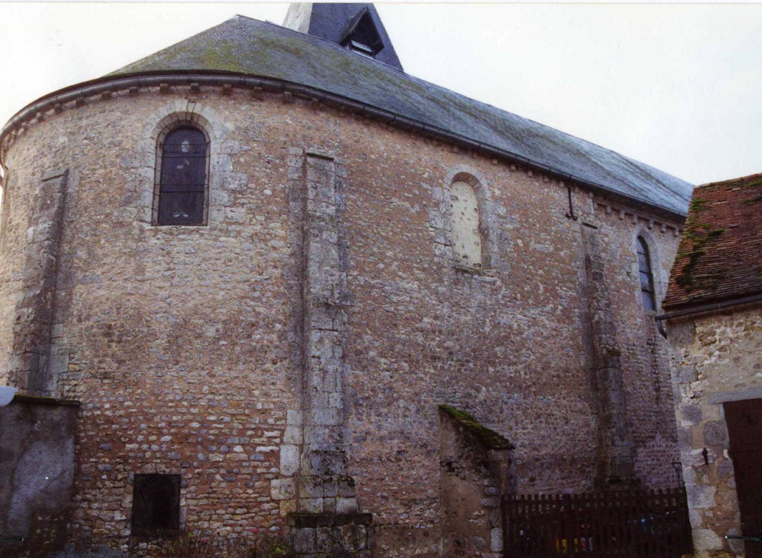 L’élévation de l’abside est la partie la plus intéressante de l’ensemble. Le mur est construit en petit appareil de moellons cubiques réguliers ; du côté nord, on distingue les traces d’encadrements en pierre d’une porte et d’anciennes baies.