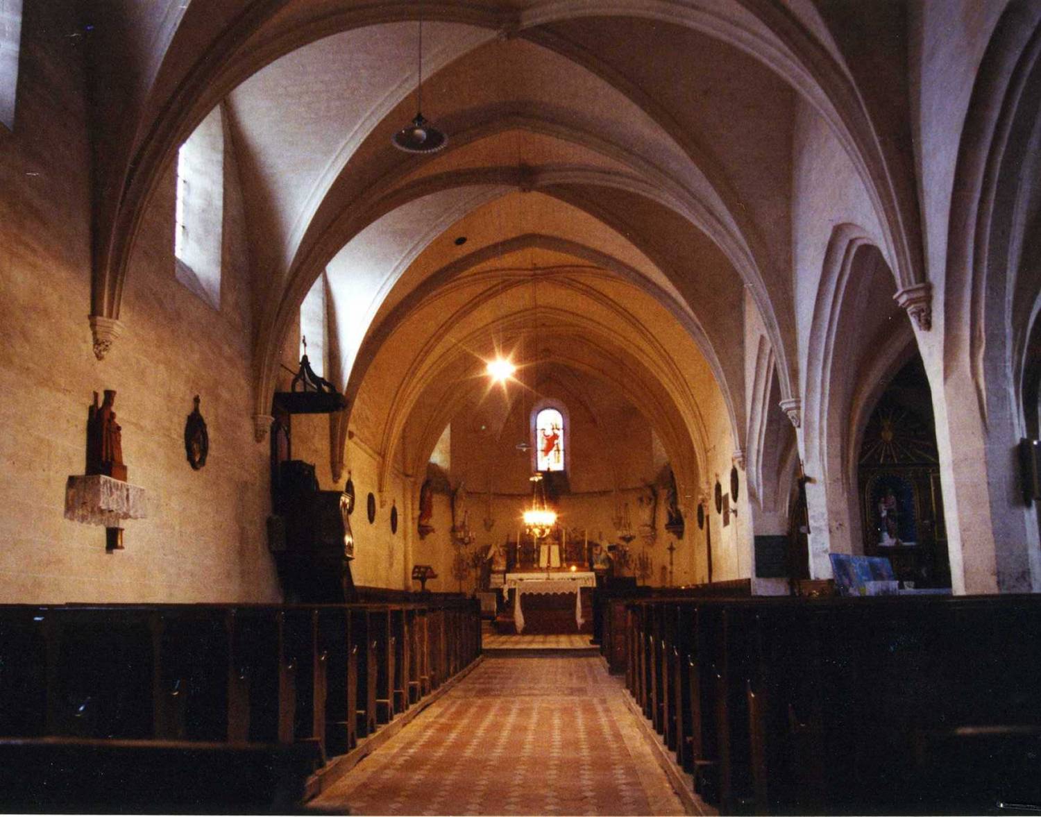 De nombreuses dispositions anciennes se trouvent actuellement sous les combles : ainsi la nef était-elle couverte d’un plafond plat en lambris qui a été remplacé en 1860 par une voûte en briques hourdées au plâtre, cachant des peintures murales dont des traces sont encore visibles sous la toiture. La nef ouvre sur le collatéral par des arcades : leur ouverture a entraîné la suppression des fenêtres hautes qui furent alors condamnées. Elles sont dissimulées dans les combles. Le bas-côté est voûté sur croisées d’ogives en pierre : au sud du chœur avait été construite une chapelle (formant comme un bras de transept sud), dont l’arc formeret fut bouché au XIXe s., lorsqu’on créa une sacristie. On peut en lire le tracé sous le toit.