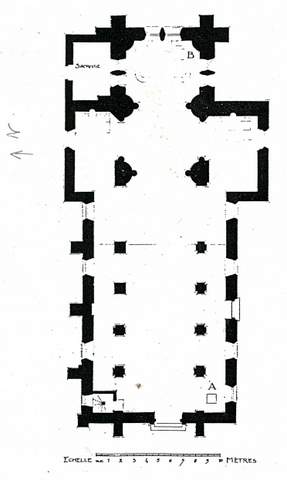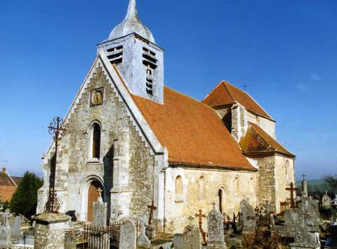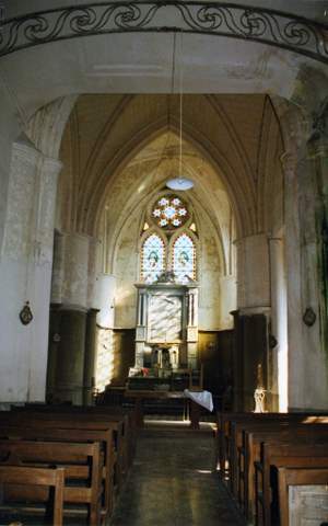 L’église de la Nativité-de-la-Vierge, dont la nef était romane et les parties orientales gothiques, a été profondément remaniée du XVIIIe au XXe siècles. Les bas-côtés de la nef ont été reconstruits sans doute au XVIIIe s. et le vaisseau central a été abaissé sous un plafond afin de permettre la couverture de l’ensemble sous un seul toit à deux pentes. Les piliers, à l’origine cruciforme, ont été repris après la Première Guerre mondiale : on leur a donné alors une forme quadrangulaire plus trapue, tandis que la façade occidentale, modifiée, a été coiffée d’un mur- pignon aux rampants disgracieux. Un dessin de l’érudit Amédée Piette du XIXe s. reproduit la façade antérieure, pourvue d’une tourelle garnie d’une horloge au sud et d’un escalier au nord, de part et d’autre du clocher établi à l’extrémité de la nef. L’inscription « Jehan 1460 » qui figurait sur la façade avant sa reconstruction, traduit sans doute d’importants travaux de réparation consécutifs à la guerre de Cent Ans. Les éléments apparemment les moins touchés de la nef sont en définitive les arcs du premier niveau du vaisseau central, brisés dans les quatre premières travées, en plein cintre dans la cinquième travée, plus ample, ce qui témoigne sans doute de dispositions liturgiques disparues.